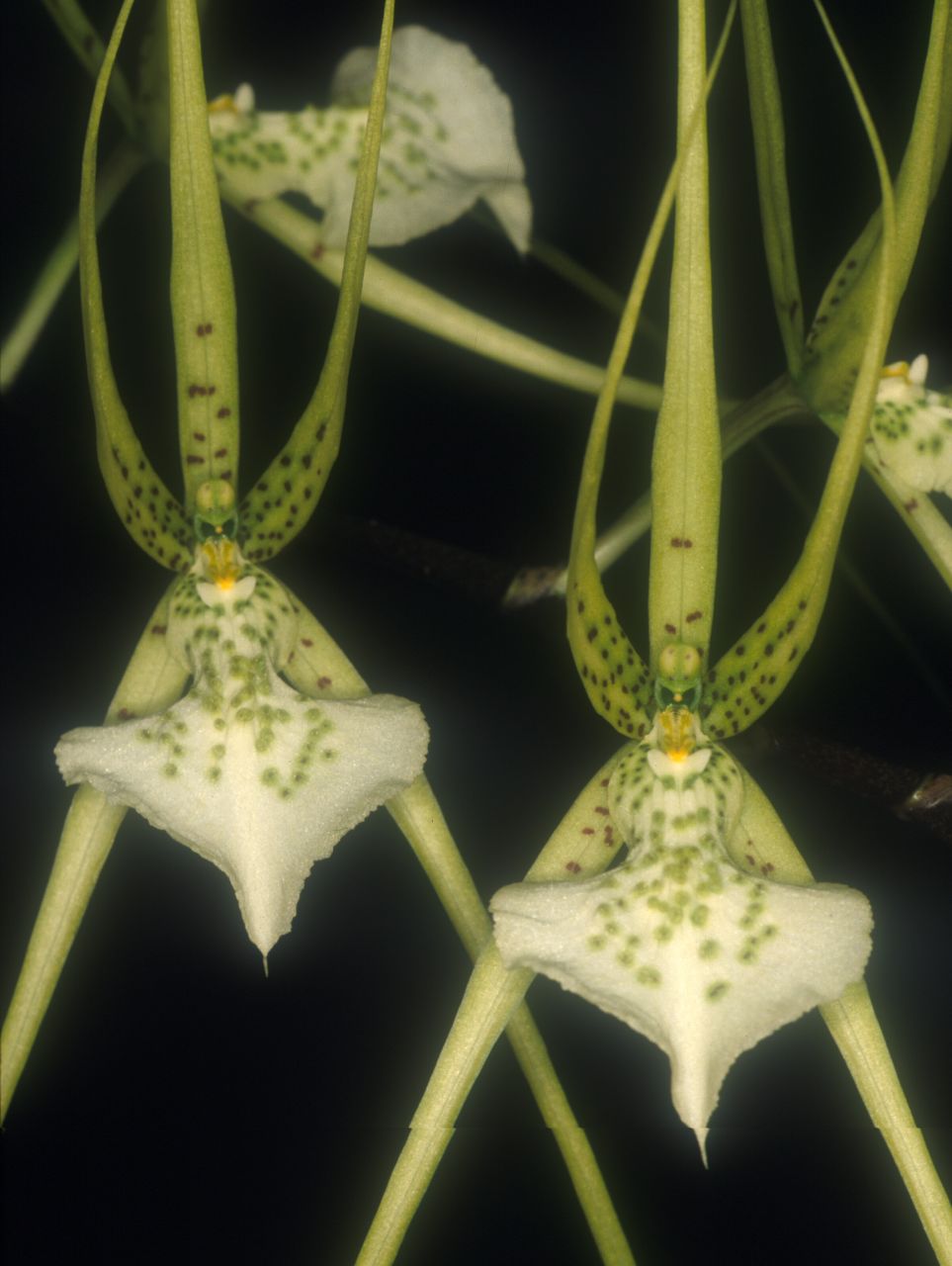 It is distinguished from the other Brassia by the green warts on the base of the lip.