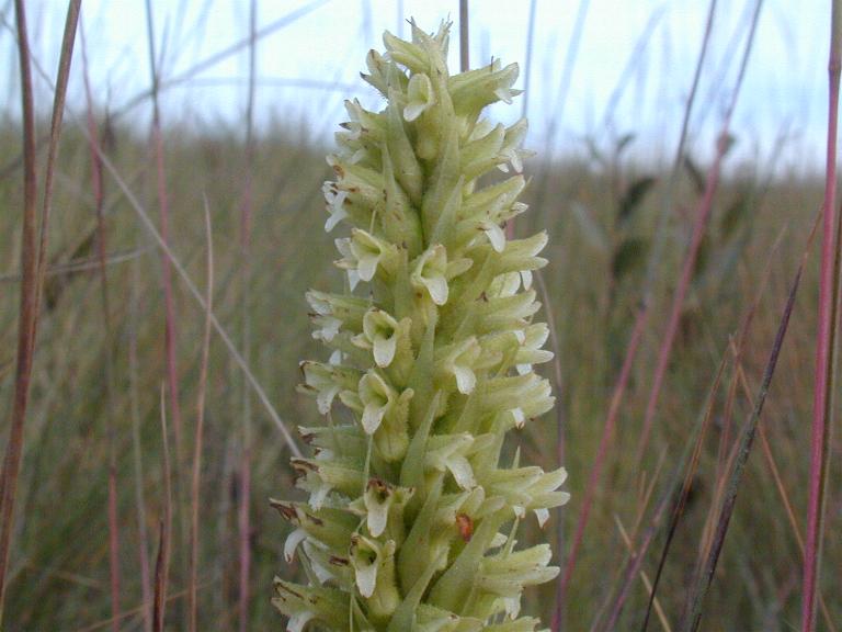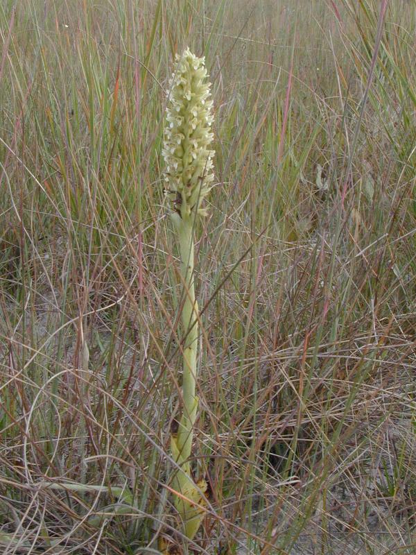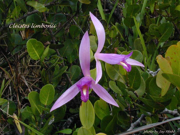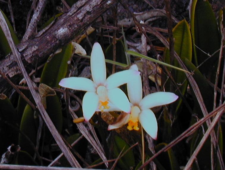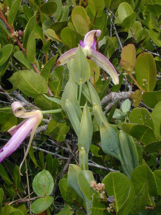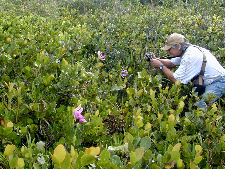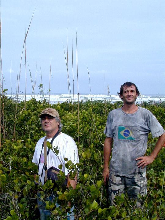 Flowering orchids were beginning to appear on every tree in this area. Here is Sopronitis cernua one of the brighter colored miniatures of the beach hammock. Now I know why I can keep this Sophronitis alive while the others languish, it grows at sea level. This next orchid is Epidendrum octans and is a large sized reed stem epiphyte. After a couple of hours of slogging less than 1/4 mile through the beach hammock we came back out to the beach. Here is Marcos Campacci and his nephew Keller Stelari. as soon as we got out to open air. Notice that it is all dwarf Sea Grape here. As we prepared to leave the beach area we were blessed with one last blooming orchid. It was Cleistes fragrans and it was magnificent in its size and brilliancy of color. The plants were nestled beneath the Sea Grapes and the flowers were held just above their top leaves. An astonishing sight and excellent way to finish up our beach exploration.