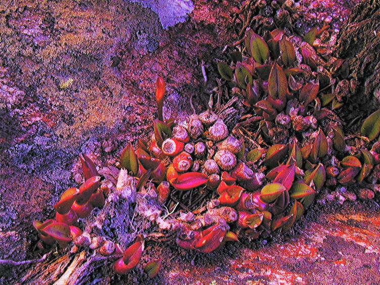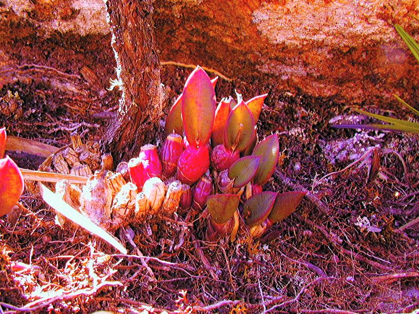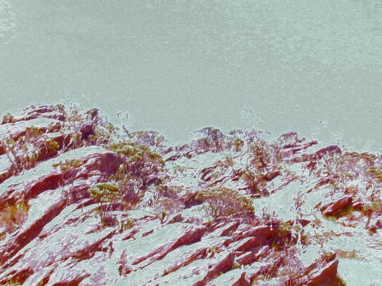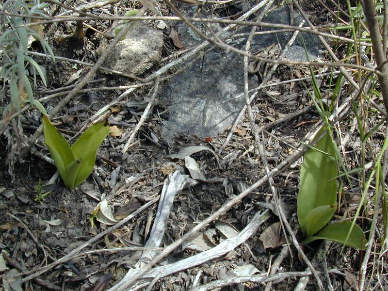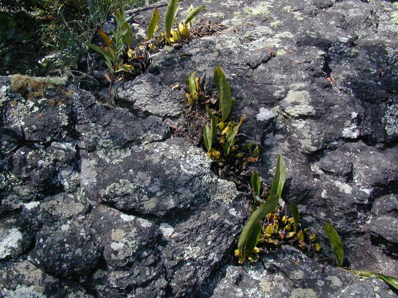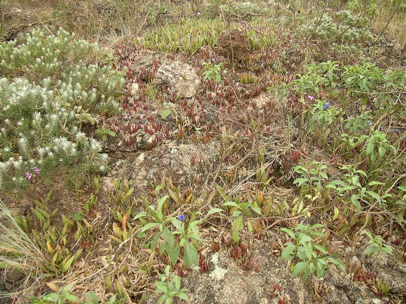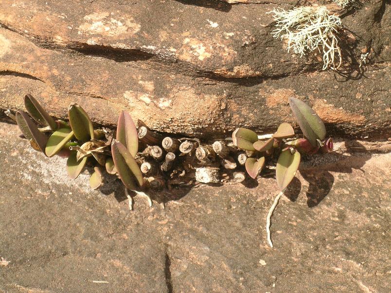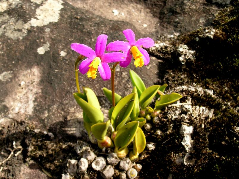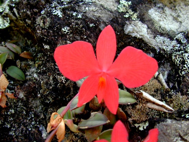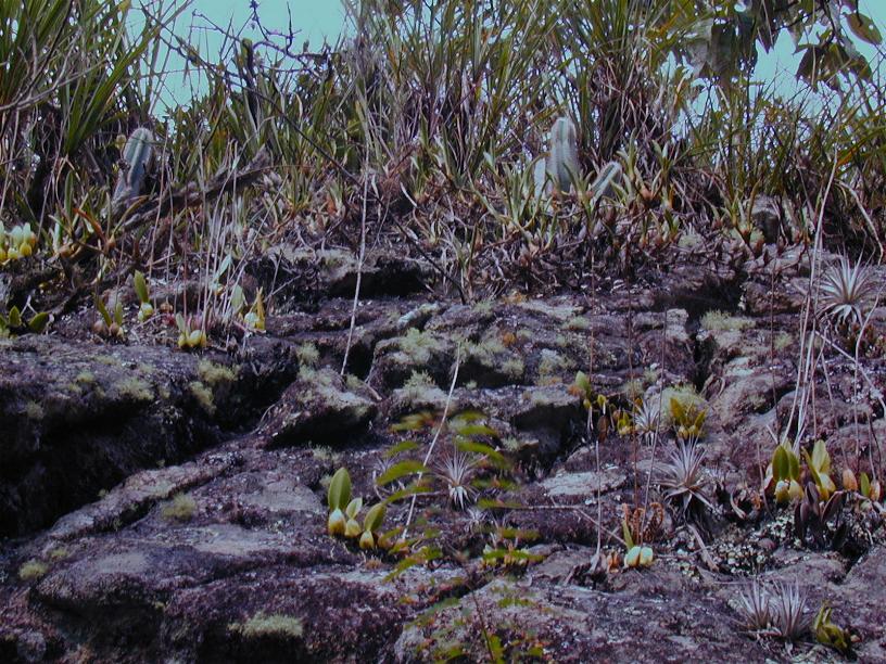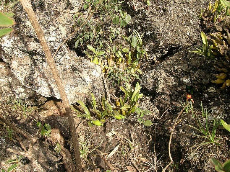 Below the rocks are small wooded copses with some dirt and from it arose terrestrial Oncidium and an unknown species. We left this spot and moved a little higher [elevation 900 meters] and discovered this epiphytic, super-miniature Pleurothallis species on a dwarf Vellozia bush. We moved higher still to about 1000 meters in elevation and this is the view from there. Our major qurry in this area was Laelia liliputana, the smallest of the Laelia and found only on this mountain top. After much searching around we came across the correct location and there they were, Laelia liliputana. This species grows to an astounding height of 1/2" and grows in the cracks of the rocks on the side of large outcroppings or along the bottom fringe in almost full sun. Often they can be found near dwarf vellozia but never on the wood. The rock outcroppings of this area are very dry, but get heavy dew in the mornings and a wet spring. Notice that only Vellozia bushes are visible.