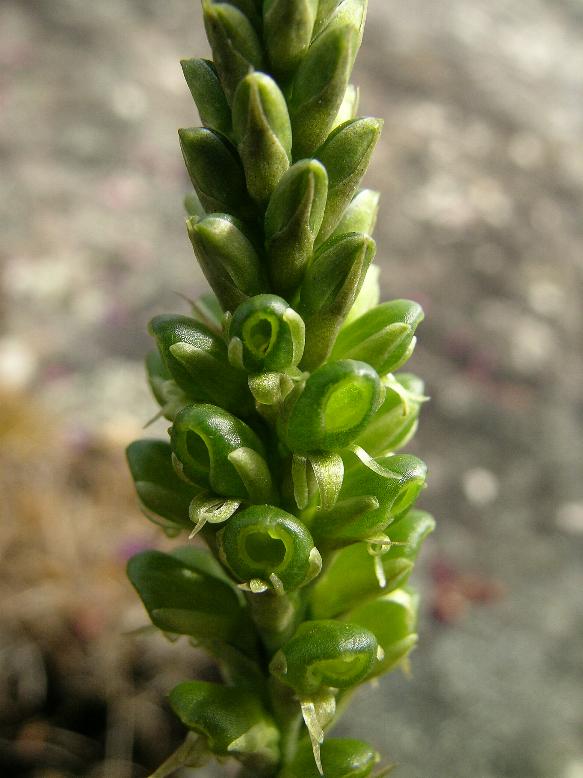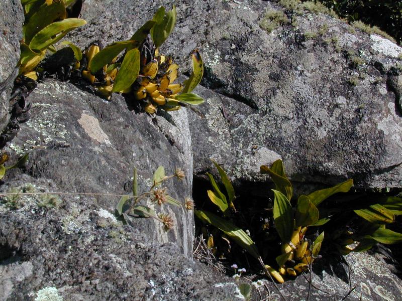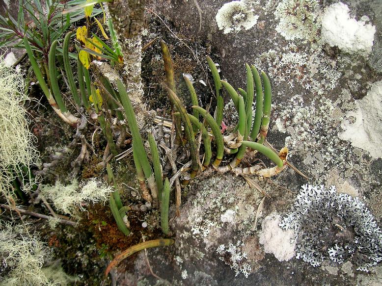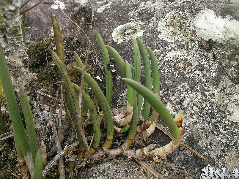 Celso, Marcos and Solange at their house in Bertioga, Sao Paulo State. After an amazing breakfast Marcos and I piled into his car for the all day journey to Minas Gerais where we hope to see many rupicolus Laelia. On the way we drove along the Mantiquera Range that runs between Sao Paulo state and Minas Gerais. The highest point in this range is the Pedra da Mina whose elevation is 2796 meters. We arrived at our hotel in Congonhas late in the evening and were up at dawn and saw this view from the hotel window. All of the orchid pictures in this next section will come from the peak seen in this photo. We drove up a long dirt road up to where the rock outcroppings began at an elevation of 750 meters. The first blooming orchid of the day was a terrestrial Skeptrostachys sp. which was in the grasslands with dwarf vellozia bushes surrounding the rock outcropping. Here is a photo of the plant and the inflorescence. As we entered the rocky area I spotted an Epidendrum saxatile in bloom. This epidendrum is one of a very few epiphytes that we found in this area above Ouro Branco and was quite common. Notice the vellozia bushes growing out of the rock. Another terrestrial that we found here was a Habenaria species. Our first rupicolus species was an Epidendrum campestre and was not very common here. One of the most common rock growing orchids that we found in Minas Gerais was Pleurothallis johanensis. Clamboring over the rocks I came across a stand of Bifrenaria harrisonae. Look at how these plants just fill every bit of the crevasses and cracks of this rock. Marcos and I scoured these rock outcroppings for several hours. One of our mostr exciting finds here was Sophronitis brevipedunculata which grew both on the rocks and on Vellozia bushes