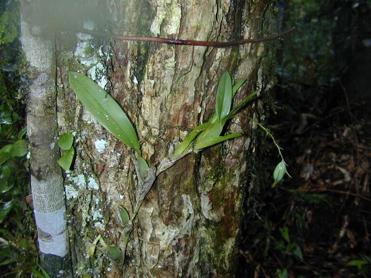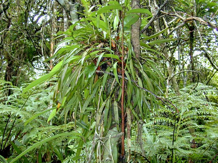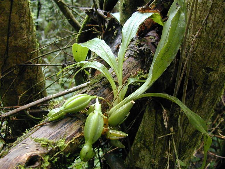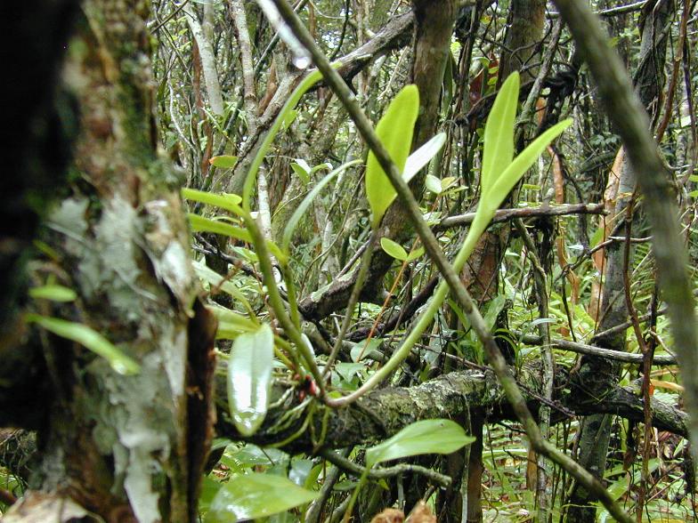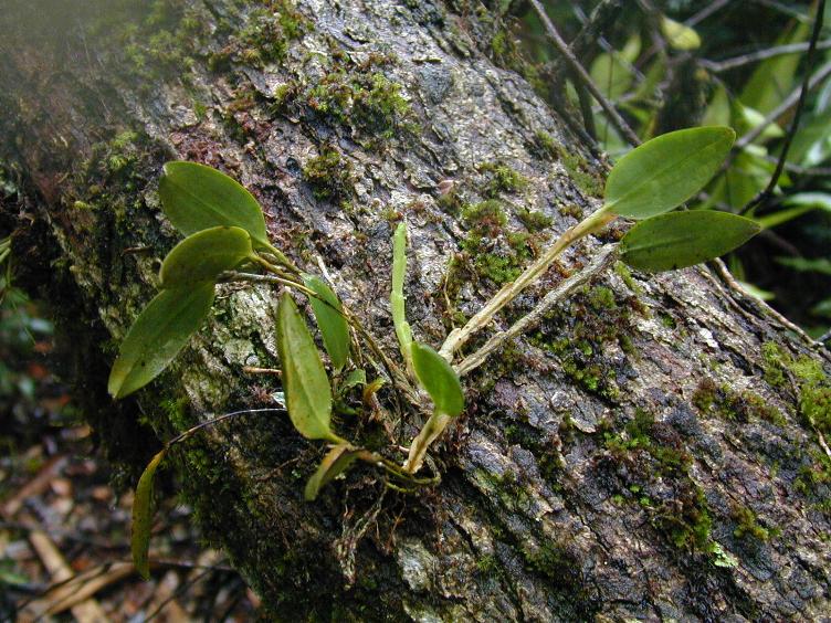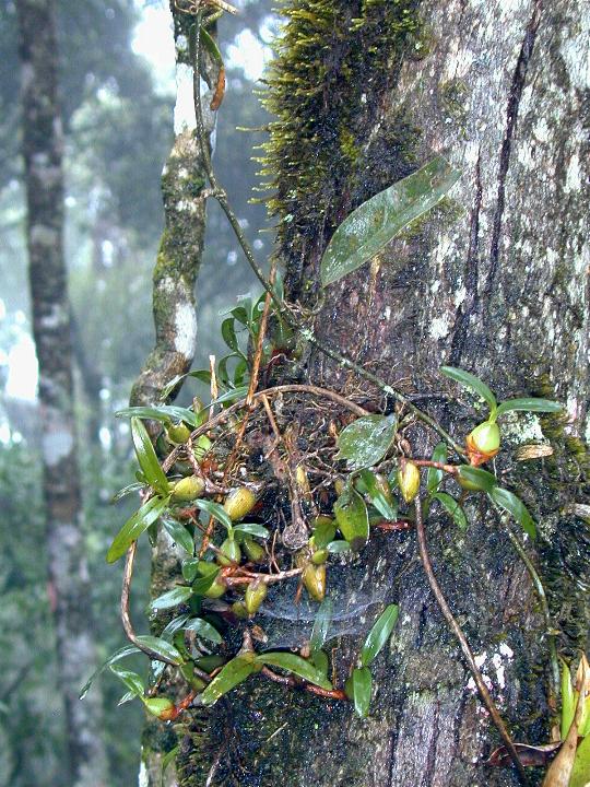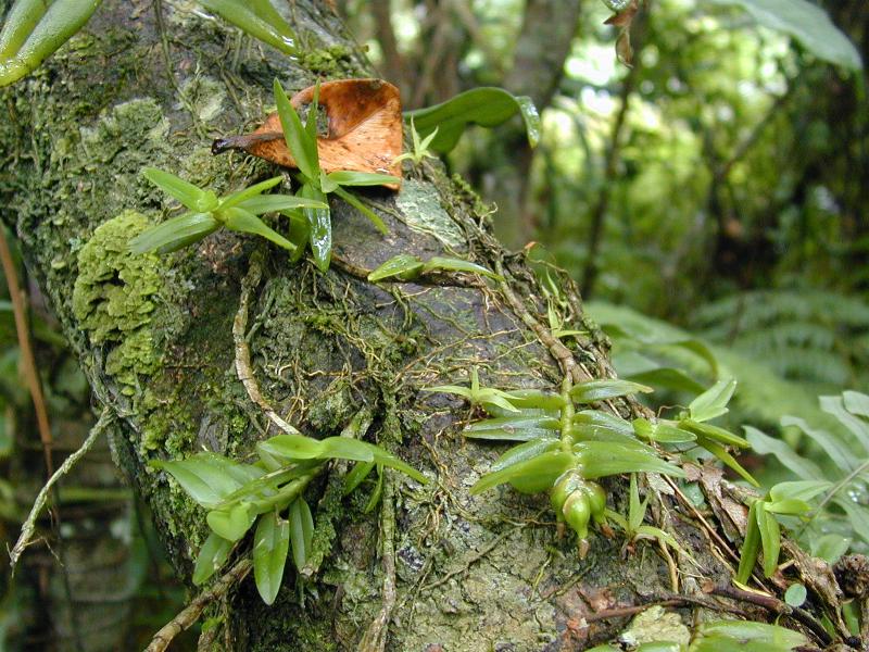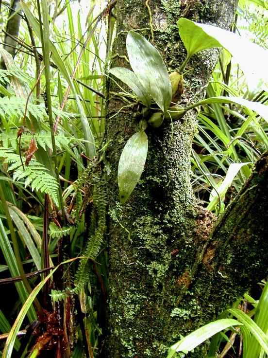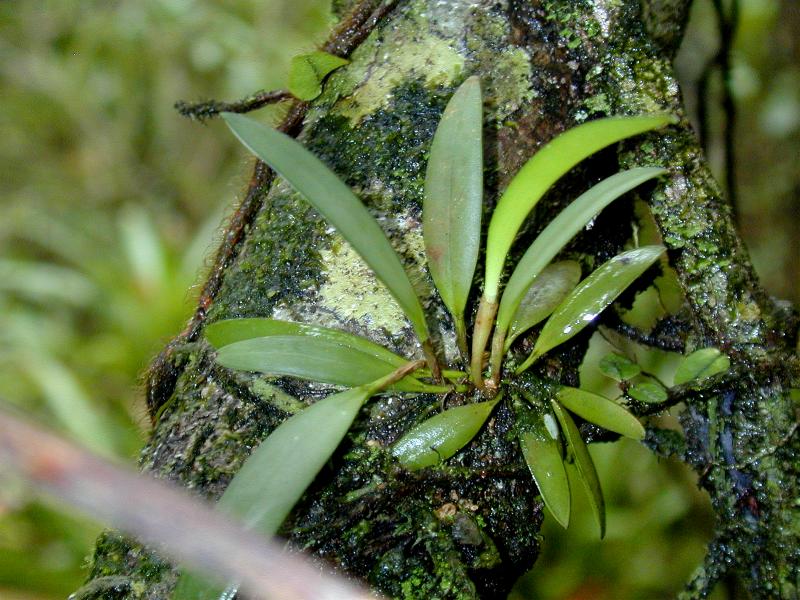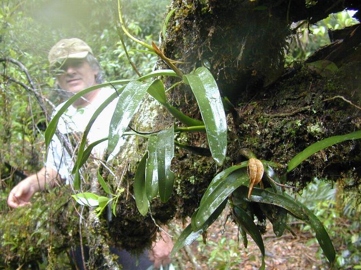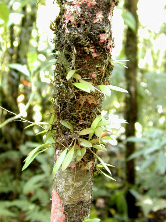 Entering the hammock a bit further we spot a giant Octomeria oxychela . Trying not to stumble because of the dampness of the trail I came to a tree covered in Epidendrum plants with capsules At this point the trail below began to became more like a muddy stream than a path and the humidity was astounding, water was dripping off of everything and as far as I could tell it hadn't rained in a day or two. They had given me rubber boots to wear and they were mostly good until I stepped into the ooze and the water and mud filled the boot. Then I felt a little better as I viewed Epidendrum nocturnum on a tree limb. This hammock seems to get wetter as we get into the taller trees, everything is covered in moss now and it is dripping wet. There is standing water everywhere and we slog along to this tree with our first Pleurothallis