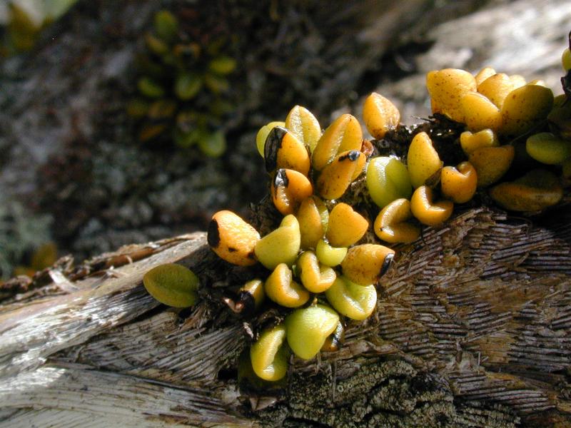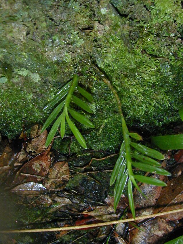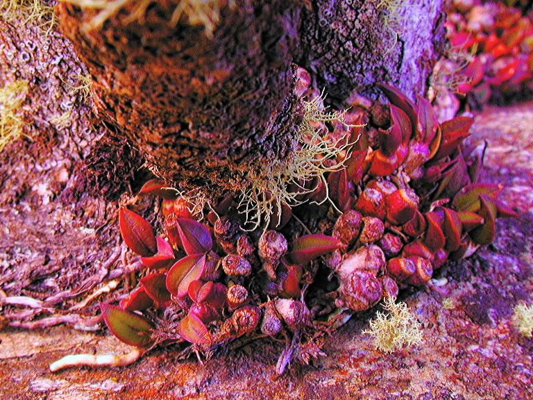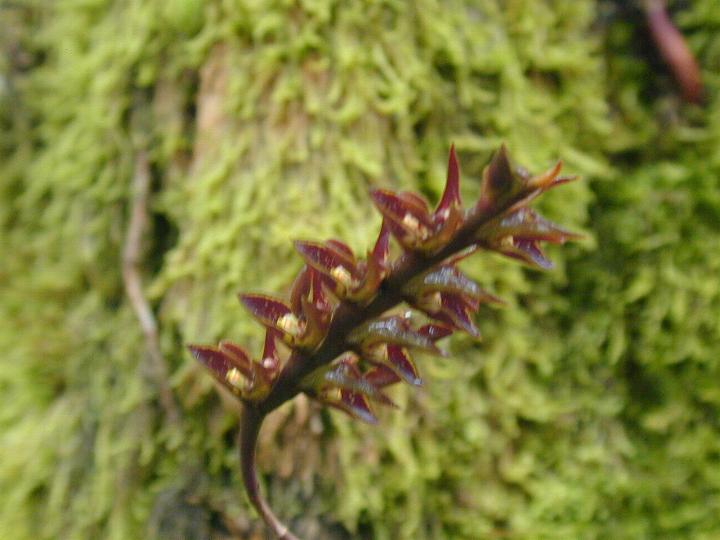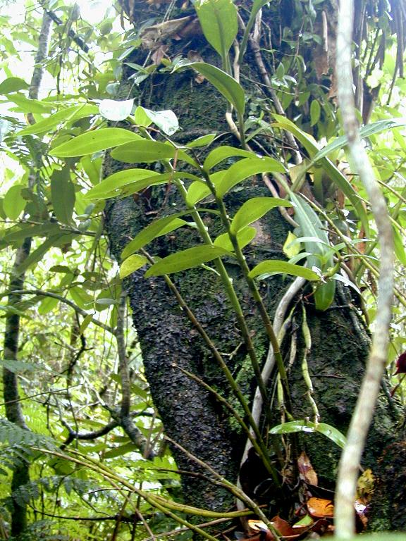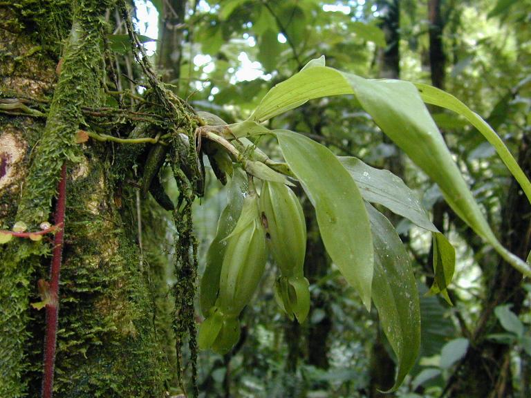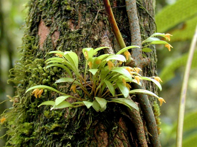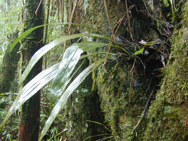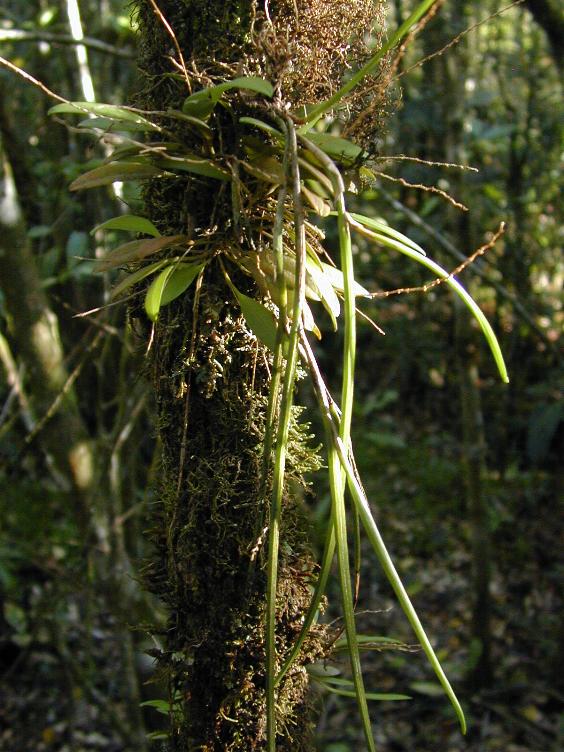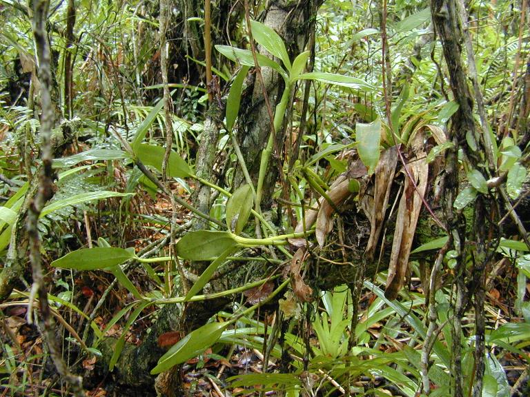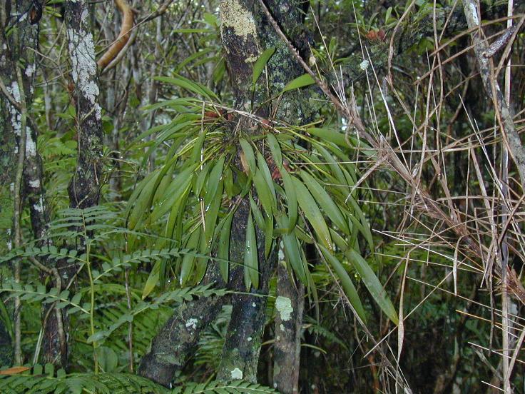 Entering the hammock a bit further we spot a giant Octomeria oxychela . Trying not to stumble because of the dampness of the trail I came to a tree covered in Epidendrum plants with capsules At this point the trail below began to became more like a muddy stream than a path and the humidity was astounding, water was dripping off of everything and as far as I could tell it hadn't rained in a day or two. They had given me rubber boots to wear and they were mostly good until I stepped into the ooze and the water and mud filled the boot. Then I felt a little better as I viewed Epidendrum nocturnum on a tree limb. This hammock seems to get wetter as we get into the taller trees, everything is covered in moss now and it is dripping wet. There is standing water everywhere and we slog along to this tree with our first Pleurothallis