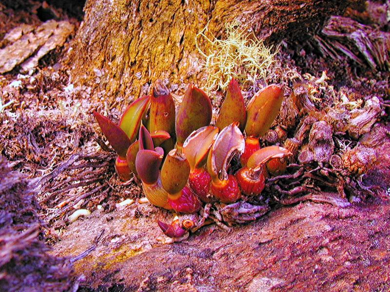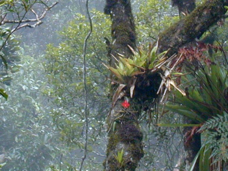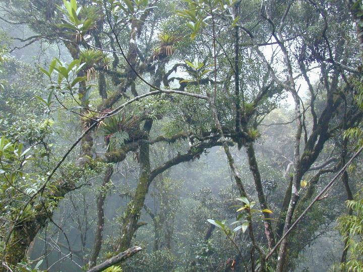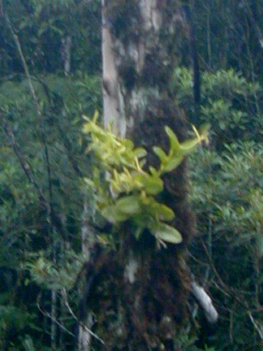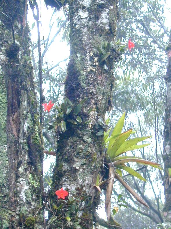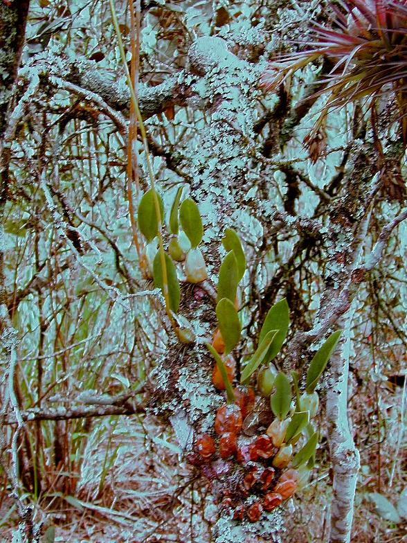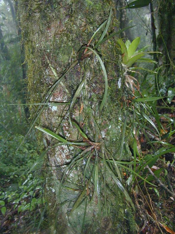 We came upon a large, fallen tree and found this Protheschea and Octomeria tricolor. Here is the Octomeria tricolor plant. Notice that Marcos, who is only 10 feet away, is obscured by the mist. The downed tree also had Dichaea cogniauxiana growing pendantly on it's side. All day Marcos has been saying that this was the place to see Scuticaria hadwenii but we had gone for a few miles and not seen a one. I got to calling "Scuttie, scuttie" as if they were a dog that would come because of the cold. If we saw one we could head back to that nice warm car. Then Marcos pointed up and said "Scuttie" and there they were 50 feet over our head, yes they are the little sticks hanging out over the side of the branch. We never got a better look at one so I guess I have to go back soon to find them closeup and in bloom. At this point soaked and cold as we were we decided to head back up the ridge towards the Microwave tower where the warm car was parked. Climbing back we noticed a plant of Maxillaria madida. On the way back up the sun made a rare appearance and this tree with a Sophronitis coccinea and a bromeliad made a bright sight over the ridges edge.