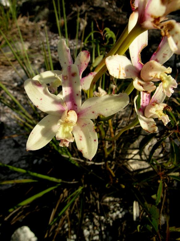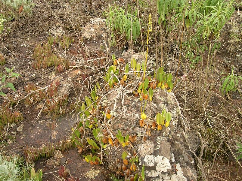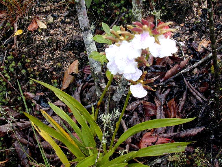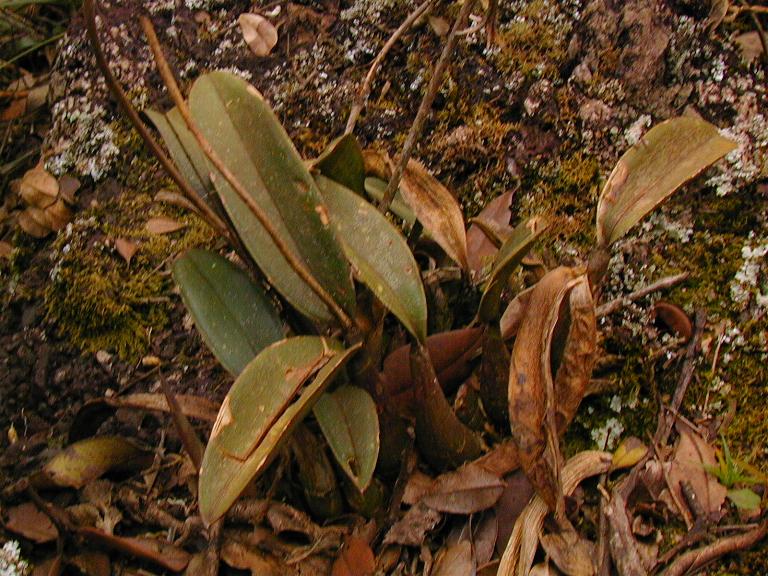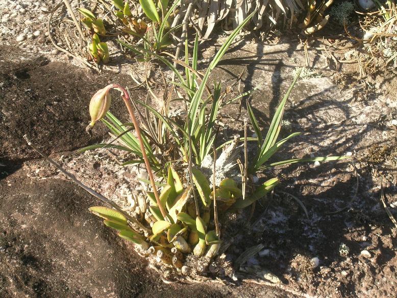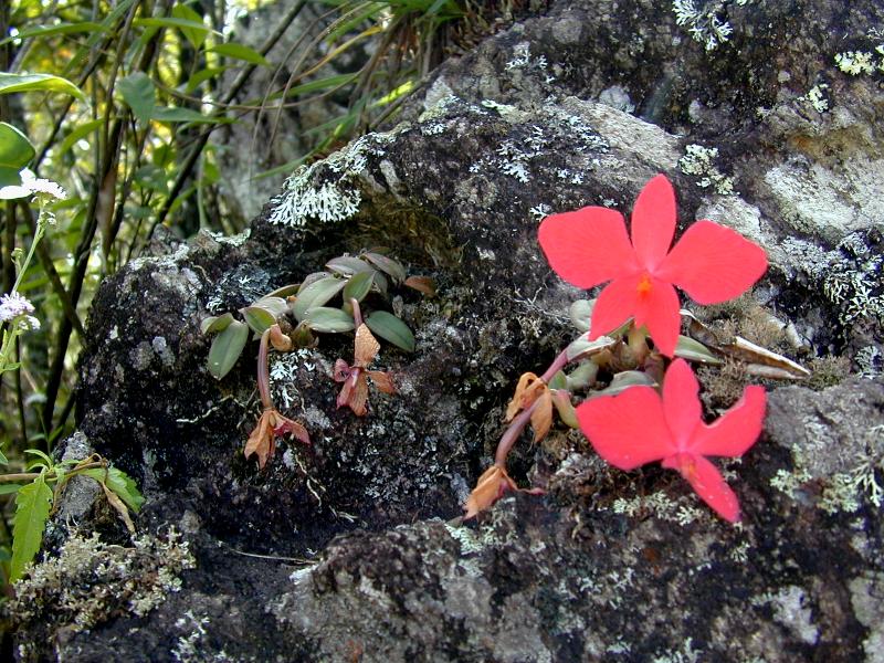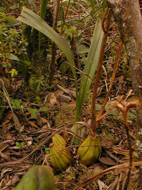 As we climbed up and over all the rocks we came across a Maxillaria villosa in flower. We made this climb to find Laelia longipes and one other orchid that will be discussed later. The Laelia were plentiful but we were there at the very end of their bloom season and after scouring the top mountain for 3 hours we only came up with 2 blooming specimens, even though there were thousands of plants. This is a closeup of one and you can see how damaged by age the flower is. This species grew on the rocks but did like to have a lot of moss around the base. After a bit of wandering on the mountain top we also found this Habenaria species. We also came across our first blooming Prescottia species. Here is a flower closeup and an even closer one. The second Laelia longipes that we found was a little fresher. Here I am at the peak of the Pico do Carapuça with much of the valley that the Monastery of Caraça occupies. Here is our Guide Jaio and Marcos at the top. Marcos had intrigued me earlier by telling me about the odd orchid that grew at the top of the Pico do Carapusa named after Mr Irwin of the New York Botanical Garden back in the 30 & 40's. We were hunting for the higher altitude Scuticaria which differently than with all others in this genus grows erect and is called Scuticaria irwiniana. We scoured the top of the mountain to no avail fro several hours and only after deciding that we didn't have to find it and we were already descending we came around the same boulder as when we went up but there it was, looking more like Rhyncholaelia glauca, Scuticaria irwiniana Check out IOSPE for the flower picture, unfortunately it was not in bloom when we were there. As we climbed down and under large rocks we came to a vantage point to see the mountaintop that we had just climbed. And here is a view from a bit farther down. We finally arrived at the monastery as the sun was setting and at a good meal and went to sleep so we could get up early the next morning and see our last 4 locations in Minas Gerais. We headed north west to get to the Parque Serra do' Cipo'. It is rolling high plains with large skeleton like rock outcroppings scattered here and there. We stepped off the road and not 20' in was this beautiful 4' tall, Oncidium spilopterum, in it's full splendor, arising from the edge of the rock and the grasslands that then stretch on for several miles to the next outcropping. This areas rocks had cracks running horizontal to the ground and the Laelia ghillanyi loved to be in and fill the cracks on the vertical surface. Notice how dry it appears. Other than morning dews this area only gets water in the late winter and spring. We got back in the car and stopped soon before Presidente Kubichek a small Minas Gerais town, here the rocks were strewn more at random and there were many flat rock formations with stoney sand spots inbetween that held Laelia breigeri, this one with a seed capsule and Laelia rupestris which grew more up on the rock surface but still in a declivity with sand, rock and dwarf vellozia and was also was carrying a seed capsule. WE got back in the car and traveled 20 mile to inbetween Pres. Kubichek and Datas where we stopped again, this time for a great dragon back ridge of rocks that snaked next to the road. Here i got out and found this Laelia in flower, although it is on it's last legs, at the base of the outcropping in the wash off from above.. After Marcos came to look at it he stated that it may be a new natural hybrid and it was most likely between L briegeri and L rupestris but he had to get back to SP and his databank to be sure. He joked about it being Laelia x pfahlii if it had not been described and thought the sound of pfahlii [pronounced fallii] was pretty funny in Portuguese. Did I fail to mention that most of the time, Marcos and I spoke in Spanish as I am fairly fluent as my wife speaks spanish and I love to travel in latin countries. I have had 28 years of practice with my in-laws and my wife as well as my 2 boys [12/17] who speak english first but soon found out that spanish helps with the latin girls even here in Key West. Anyway it actually is Laelia x christinae and here is how it looked as a plant. This was our last orchid stop of the trip and it proved to have a couple of other oddirties. The first is a terrestrial orchid called Pelexia laminata which was also found in the scree and erosion area of the larger rock outcropping and here the plant grows in a grass clump. We also found a lithophytic Cyrtopodium species, which one I have no idea. MArcos took this picture of me at the last stop. I am looking at a Laelia rupustre. We got back in the car and started to drive like mad to get as far south today as possible so we could get into Sao Paulo early the next day, saturday as I had a flight out at the crack of dawn on Sunday. We drove and drove and I must say most all the roads we were on that were paved were excellent but after we got to Corvelo things went nightmarish. It was 1 am and we had done 100 miles in a red haze of almost opaque dust, avoiding wideflung holes that were filled with the red dirt of the area and semi-trucks weaving across all four lanes of traffic trying to avoid them. None of us were having much success and the jolt of ending up in one was teeth jarring. Trying to see through the dust was unbearable and as aproaching semis with their lights on high made for a blinding experience. All of a sudden there was an orange light and I said Marcos there are traffic cones , so he veered off to the right and went 30 yards or so and I said Go left!!! There is a cop. We just barely missed him and I said to Marcos "I think we have a flat, man" and he Says "naw, bgut I need a cup of coffee. WE turned in 200 hundred yards ahead got out of the car and sure enough we had a flat, we take the car to the flat fixeer and start to wait when up walks 2 giant policemen. One Asks me" Why did you try to run me over!" and I said "talk to him he is the Brazili