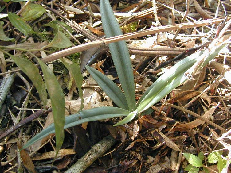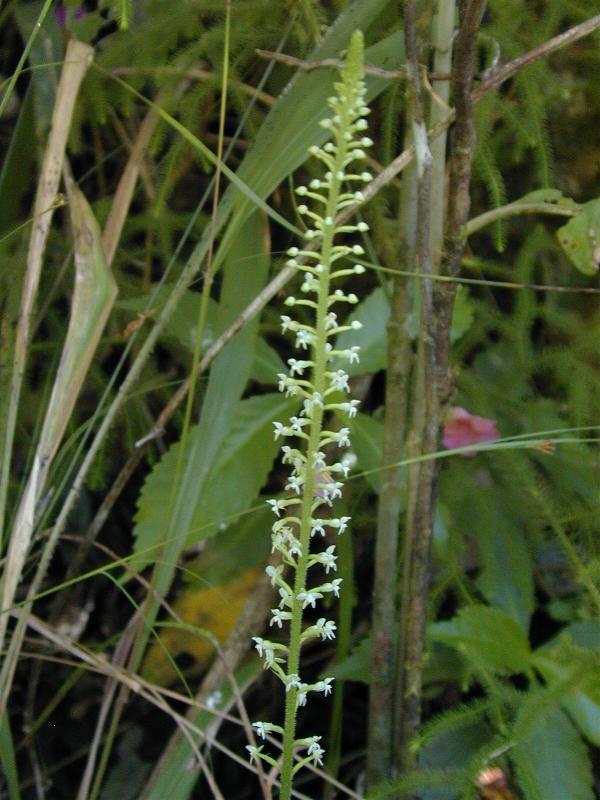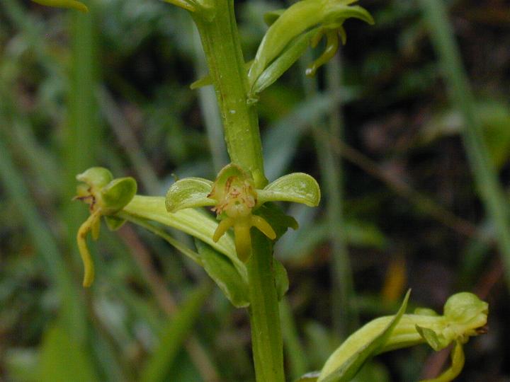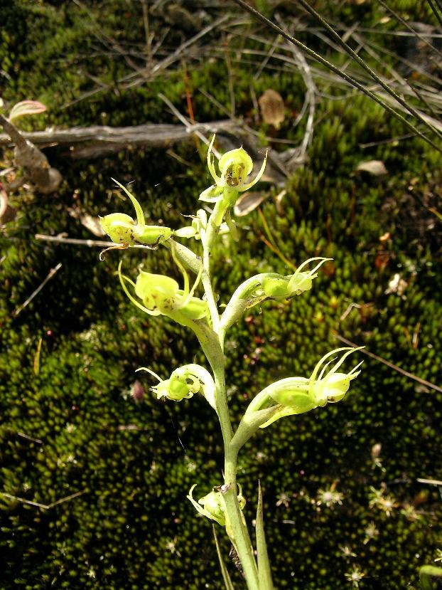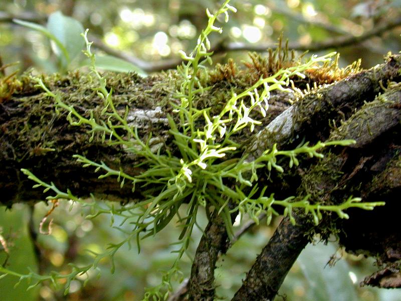 Here is a closeup photo of Sophronitis coccinea on a tree trunk with thick moss. Here is the same even closer still. Here is another. All of the Sopronitis are miniature, Cattleya alliance orchids with brilliant red or yellow flowers and even in a haze are quite visible midway up the trunk of forest trees. Onward through the fog we went seeing hundreds of orchids out of our direct site as they were high in the trees, but then a low branch near the trail and viola! a flowering specimen of Epidendrum proligerum appeared. A common epiphyte in this area was Gomesa glaziovii which has a very spread out growth habit. Orchids grow on the ground as well as in the trees here so you much walk slowly scanning up and down. It can make for slow yet exciting going. Here is a Cyclopogon species on the ground.