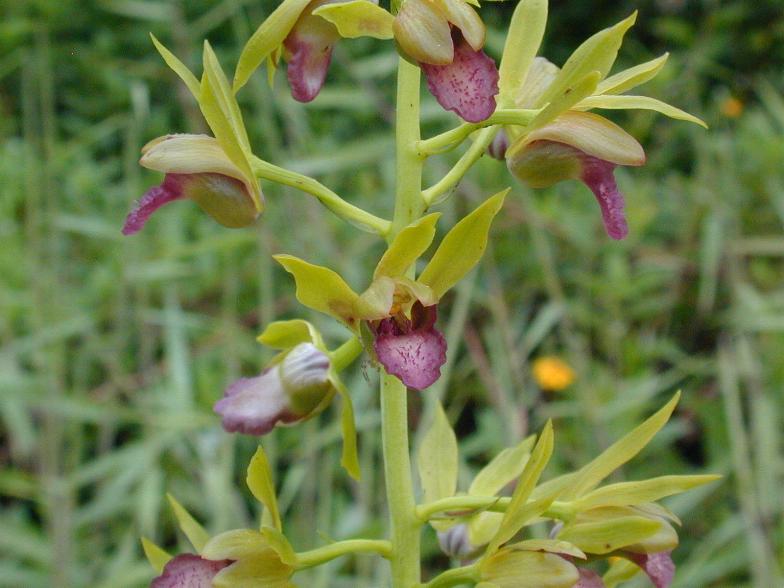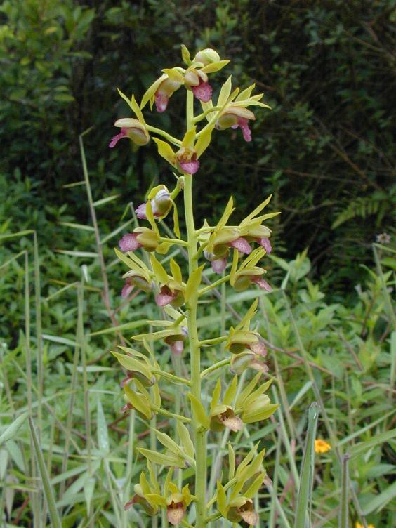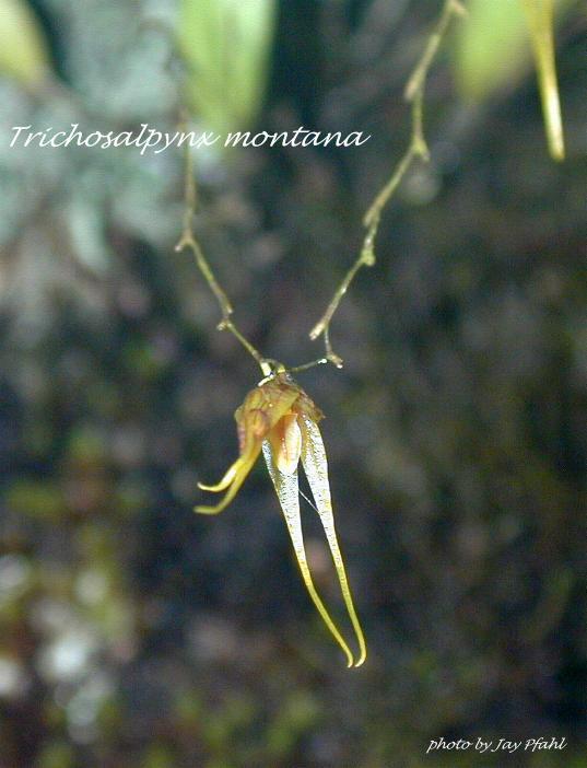 As we drove we saw this Habenaria sp in bloom so we had to stop. Looked around a bit more and saw this Habenaria species in bloom. There was also a plant of Sauroglossum nitidum. Off we drove lower and lower and we came upon a rocky outcropping with black rock and a Zygopetalum intermedium. Here is a flower closeup. Driving a few miles farther we came across a Cleistes limbonii gathering. There were some 20 plants right along the side of the road. Here is a photo of the normal version of Cleistes limbonii and right beside it a Coerula variety. It was getting to be late in the afternoon but we just couldn't stop finding more blooming orchids. Here is an Octomeria grandiflora photographed against the hood of Marcos' car. Around the next bend we found a pool with a giant Habanaria speciesgrowing in the center of the bog. and then a few feet into the brush on the other side of the road was this Trichosalpinx montana. Marcos Campacci, my guide and fast becoming good friend, pointed to a tree beside the bog and said "There is Epidendrum campaccii". Sorry about the lousey photo. A few seconds went by until I asked "Campacci?" and he said "yes that species was named for me by Hagsater & Sanchez back in 1993."