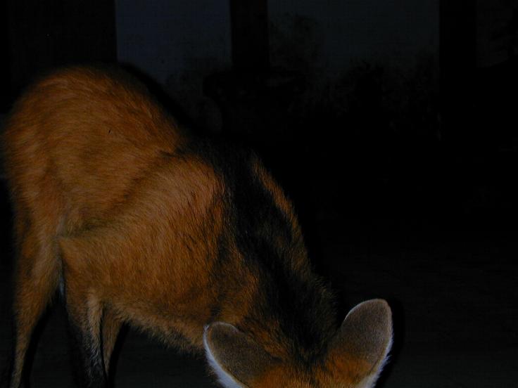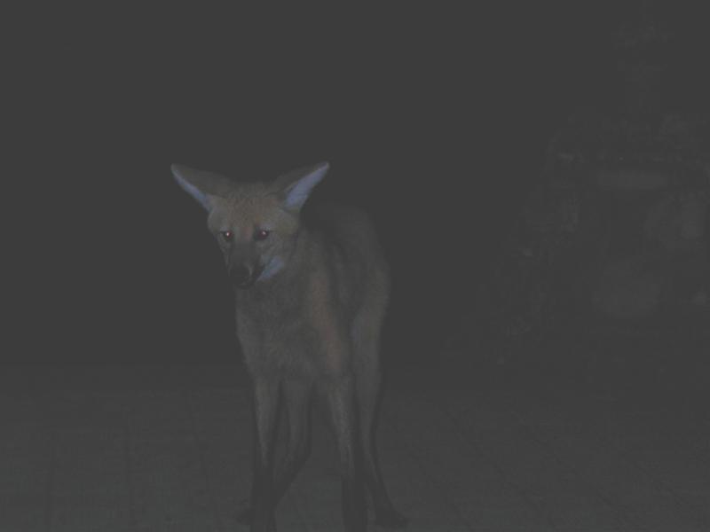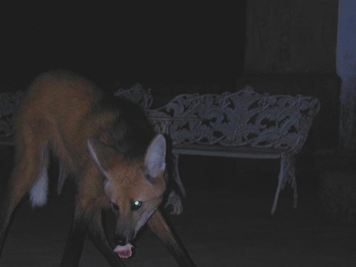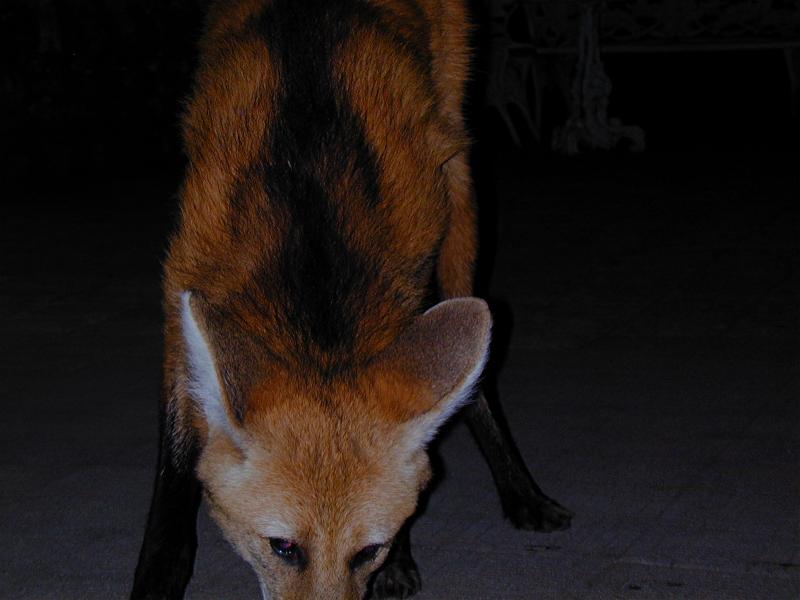 Our next destination was El Morro do Chapéu which is just outside of Belo Horizonte. This area has red soil and small rock outcropping with lots of small stones strewn throughout. There is a scubby forest, where there is more dirt, of small bushes that then open to the rockier areas where only rupicolus orchid and some cacti. In the areas with more dirt we found Laelia crispata and Oncidium gracile. The bushes protecting these orchids were less than 5 feet tall and there was a lot of leaf litter. We pushed our way out to an open rocky area and low and behold there was a blooming Laelia caulescens. It has very large flowers for a smaller plant. This photo shows the broken rock terrain that suits this species. Notice that there is a lot more other type of vegetation around than with the other Laelia we have seen so far. We came adross this wonderful four flowered specimen. This photo shows more of the typical terrrain that Laelia caulescens enjoys. The red things are Pleurothallis johanensis. As you can see it has many other plants growing in close to them, which is different than most of the pther rupicolus Laelia. On one of the few free standing rocks in the area we found this colony of Bulbophyllum weddellii. A closer view. Notice all the Pleurothallis johanensis arising out of the declivities of the cap rock. Here is a shot of the hillside that all of these orchids were growing on. There was only this one spot that had a depression in the cap rock and it had a different orchid growing in it, a Protheschea species. The motherlode of blooming Laelia caulescens. After an hour or two at this spot we hightailed it to our location to spend the night. We were headed towards La Caraça, a Lazaran monastery. It was built in the 1500's and has been a school for the elite youth of Brazil up until the school burned down after the turn of the 20th century. Now with only 4 monks and all of them over70 years old they have turned to tourism to keep the site alive. They are situated in the center of 4 mountains and have 70,000 hectares of virgin wilderness surrounding them. It is an amazing and serene paradise. We pulled in as they were locking the gates for the evening and arrived at the church as the evening service was being held. Marcos warned me that something incedible would happen here tonight but he would not let on what it might be. After the service everyone went out to the front patio of the chapel and we sat down in the dark. There was a set of stairs leading out to the wilderness that encompassed the monastery. The head monk came out and started chanting "Guara, Guara!". I looked at Maarcos and thought UhOh here comes some weird religious ceremony. The monk had a large metal platter that he covered with scraps from the dinner table and was pushing around on the floor so it would make a loud grating noise. What the heck! Soon everyone got quite and up the stairs came something. It was pitch dark and all I could tell was that something was there. Are we looking for hungry ghosts? After a moment the preist said "take pictures now and with the flash of the light we saw a large, tall red and black dog-like creature right at my feet. I didn't know what to do, other than continue to flash the camera. I kept asking "what the hell is that? Marcos told me that it was a wolf. I was not aware that South America even had wolves, especially red and black ones. I had to get all the way back to the US to discover what they actually were. The red-maned wolf a solitary, 60 pound, very rare wolf found in Peru, Brazil, Paraguay and Argentina and is extremely threatened by cattle ranching and developement. We saw four different wolves here, each came in a half hour apart as they are solitary animals. An incredible evening sitting in the pitch dark.