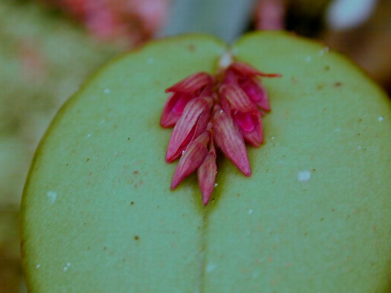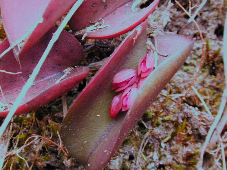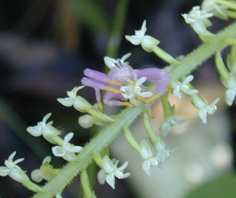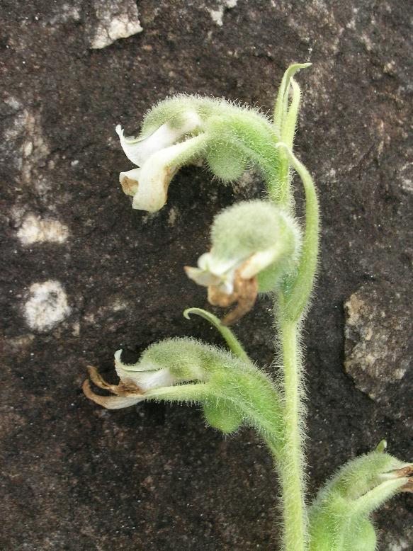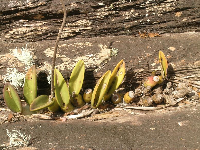 The next morning we groggily got up and Marcos said we were off on a 20 mile round trip hike down the canyon. As soon as we got on the path we found Zygopetalum mackaii in bloom. Here is a flower closeup. As I have said before, Bulbophyllum is a commonly found genus in Brazil and here was no exception. Our first find was Bulbophyllum warmingianumgrowing up the side opf a large boulder. Pleurothallis also grow on boulders here a case in point is Pleurothallis prolifera and here is one with a seed capsule. As we walked down the trail we came to a wall of stone on one side and it had a water seep. I scrambled up and found that 10' up it leveled of to a steady slope and there where many dwarf Vellozia buzhes with their roots in the water. Upon closer inspection I saw large psuedobulbs laying over and on top of the plants and with roots onto the caprock below. After a short search we came up with a flowering specimen of Psuedolaelia irwiniana, a Schomburgkia to Psychilis like psueudoepiphyte lithophyte. The plant has a long inflorescence to 4' and has the successive flowers at the apical end with only one to 3 open at a time. A little farther on we encountered this miniature Laelia fournieri and the plant below. This is what they call Lanium berkleyi there but is said to be the same as L. avicula. I did not see it in bloom soI can not say, but if Marcos says there is a difference then there most likely is. Marcos and I found a spot where the river we were walking along disappeared and took off down this canyon underground to where it appears just before a waterfall a half mile below. Marcos worked one side of the canyon and I worked the other. Notice all the orchids at his feet and on the side of this large rock. Each side had it's own distinct species which grew only there and not on the other. On my side I found Pleurothallis hamosa which has the odd, stiff, curled leaf with the flowers protected inside.