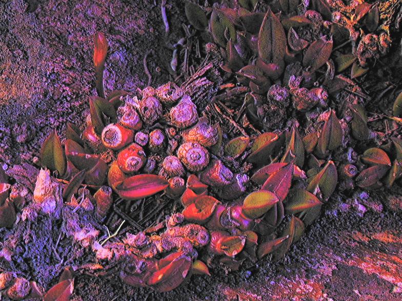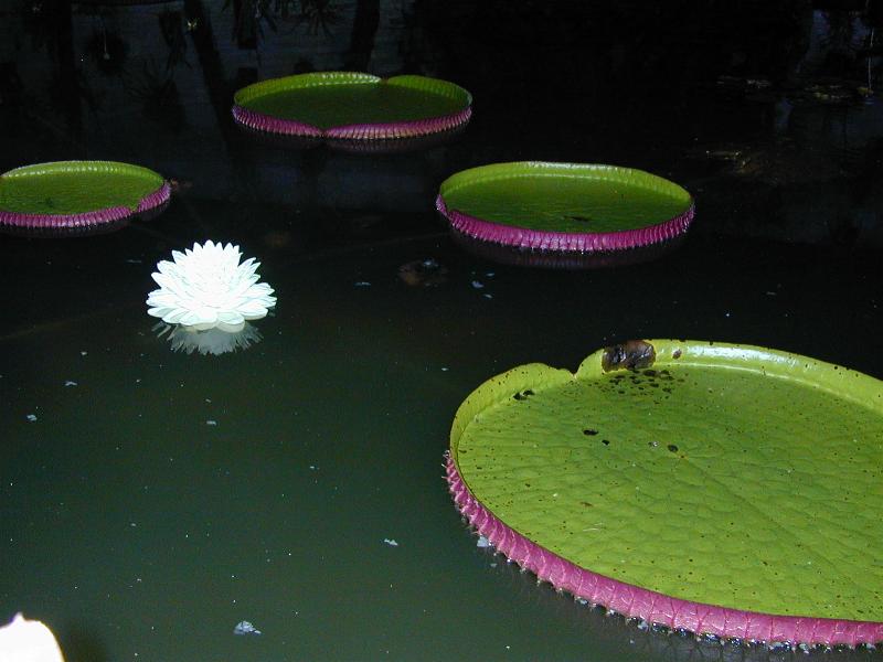 We moved on to another flatter, brushier area and found this Cranichis candida in full flower. As I was taking the picture I noticed a pink smudge moving among the flowers. I used my camera to get this closeup shot of the culprit, a pink and yellow spider? If anyone has an idea what this really is write me [jfal@sprynet.com] as I would love to know. We also found this catapillar not far from the Cranchis. Here is a Vanilla edwallii growing up against a tree. Maxillaria picta was a comon epiphyte in this area. Another very common epiphyte was Oncidium forbesii. A fairly uncommon terrestrial, Psilochilus modesta was found in the deep leaf mold of the forest floor and had a seed pod. There was also a Cyclopogon species with gray green leaves. One of the smallest flowered species in the Cattleya alliance is Reichenbachanthus reflexus a monmotypic genus only found in Brazil. Pleurothallis seem to like small moss covered trees. The orchid species pictured here may be a Jacquiniella, but if it is it is the largest one I have ever seen. It was at least 8" in length. One of the last orchids that we found was Dichaea australis and I am not sure what it is. Notice all the seed capsules. As we trudged back to the rosd we encountered a blooming Phymatidium delicatulum. We arrived back at Solange and Celso's house and they showed me their Victoria-reginae Lily that they had growing in a large pool. This is the largest water lily in the world and can have leaves that are 8' across. The flower in the picture is at least 12" across.
