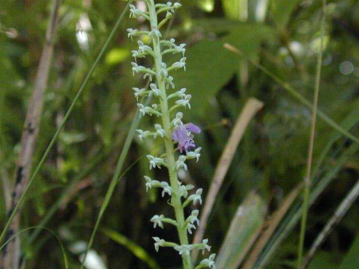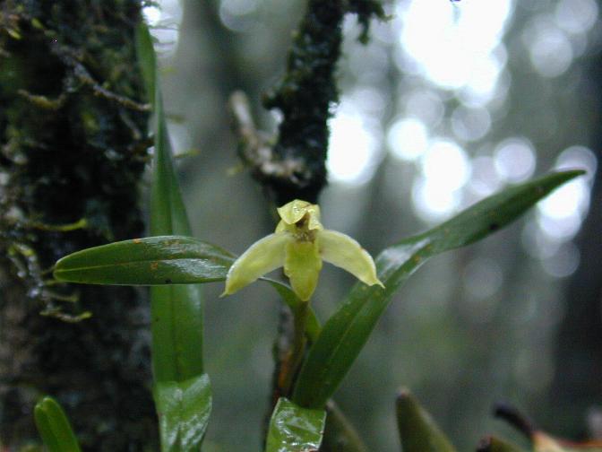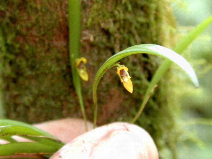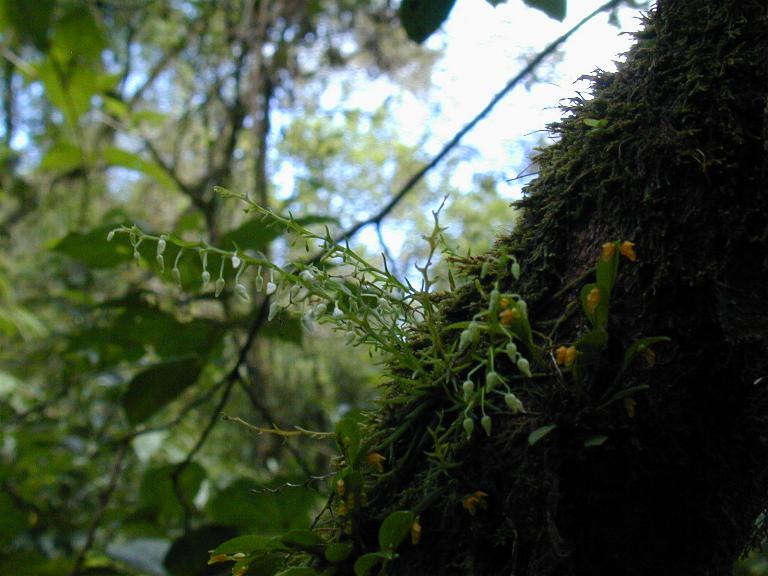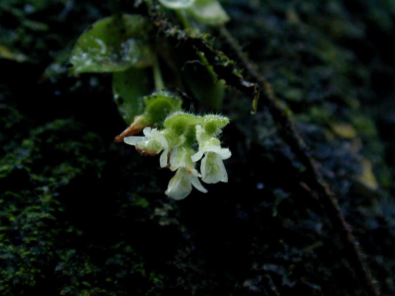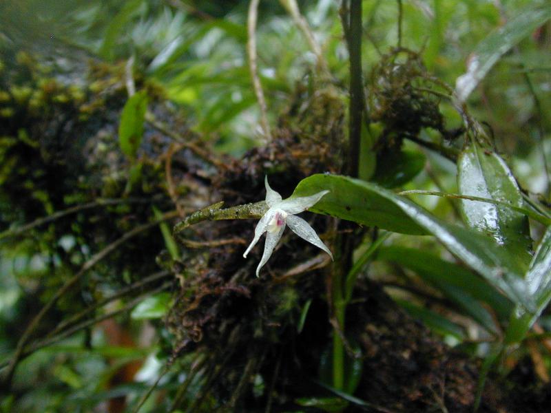 Notice the moss and heavy lichen that this tree has. Marcos and his nephew, Keller [a young man who helped us do the dirty work]. Octemeria oxycheila was a common plant here. Marcos points out our first flowering orchid Pleurothallis saundersiana. After a bit of slogging through the water that now was more like a lake than a stream I saw white out of the side of my eye and then turned and saw the cutest miniature, a Lankesterella . Here is another angle of the same flower.