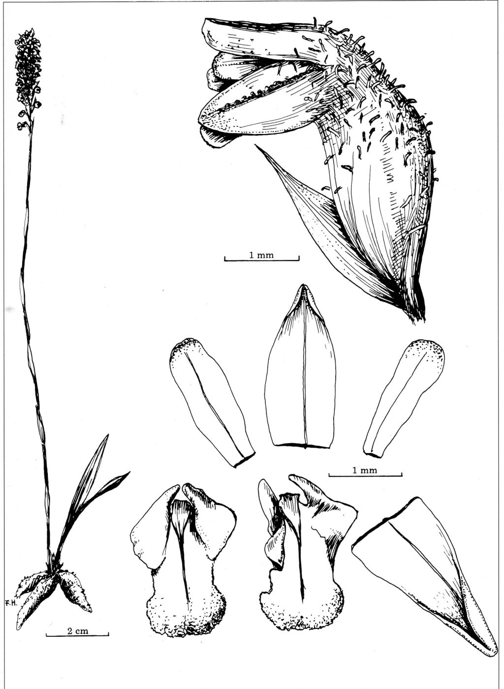 Found from Mexico, Guatemala, El Salvador, Costa Rica, Trinidad and Tobago, Surinam, Fr Guiana, Guyana, Venezuela, Colombia and northern Brazil in open meadows at elevations of 250 to 1320 meters as a miniature to small sized, hot to cool growing terrestrial with thick, glabrous roots giving rise to a slender stem with several, loose, lanceolate to ovate-lanceolate, acuminate bracts and carrying few fugaceous leaves that blooms in the later spring on an erect, cylindrical, 2.4" [6 cm] long, congested, many flowered inflorescence enveloped by various, tubular, acuminate bracts.