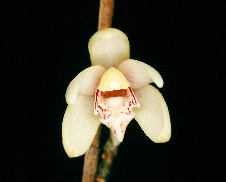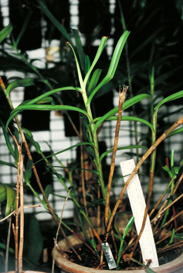 Found in southern Malaysia in forests on trees, dead trees and on rocks at elevations around 800 to 1400 meters as a giant sized, warm to cool growing epiphyte with an erect, stout stem enveloped completely by basally clasping leaf sheaths carrying to 35, linear to oblong leaves that blooms in the winter on a lateral, to 1" [2.5cm] long, successively 1, to 40 flowered inflorescence.