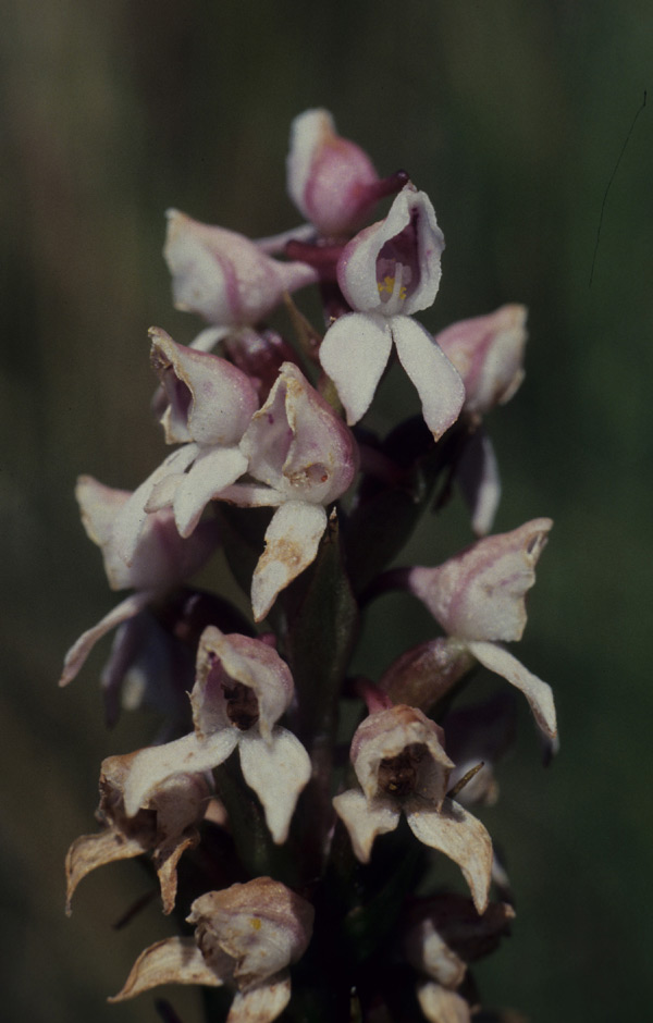 Found in Malawi in montane grasslands and rocky heathlands at elevations around 2100 to 2400 meters as a medium sized, cold growing terrestrial with testicular tubers giving rise to an erect, slender, somewhat flexuouse stem carrying 2 basal sheaths, the lower hyaline, shorter, the upper, much longer, scabrid to shortly pilose, dark brown to black, 1 to 2, prominent veined, erect, narrowly lanceolate, acuminate leaves that blooms in the late summer and early fall on an erect, to 2" [5 cm] long, densely many flowered inflorescence with narrowly lanceolate, acuminate, as long to longer than the ovary floral bracts and carrying resupinate flowers.