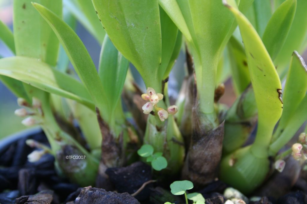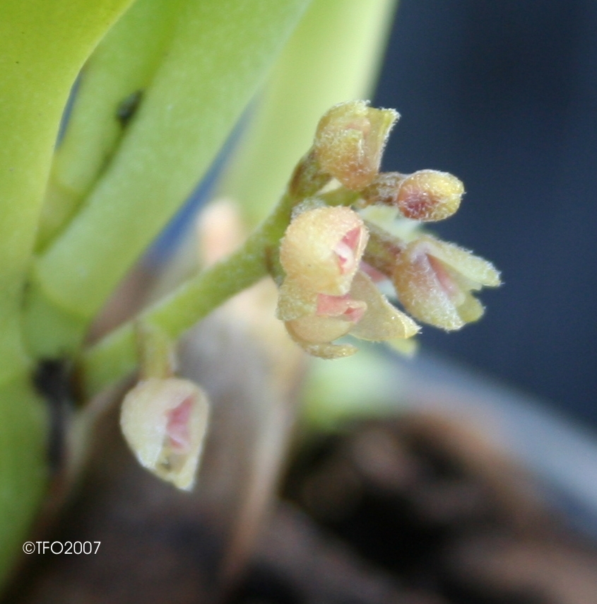 Found in New Guinea, Solomon Islands and Queensland Australia at elevations of 20 to 1000 meters on rocks and trunks of trees often close to streams as a small to just medium sized, hot to warm growing epiphyte with .4 to .8" [1 to 2 cm] between each cylindrical pseudobulb carrying 2 apical, narrowly elliptic-lanceolate, acute to subacute, gradually narrowing below into the petiolate base leaves that blooms in the late winter and spring on a racemose, erect, 10 to 20 flowered, 1.6 to 2.8" [4 to 7 cm] long inflorescence.