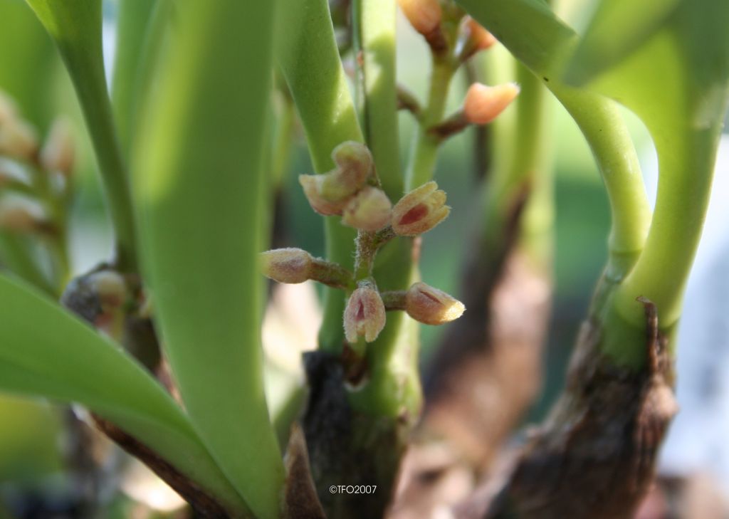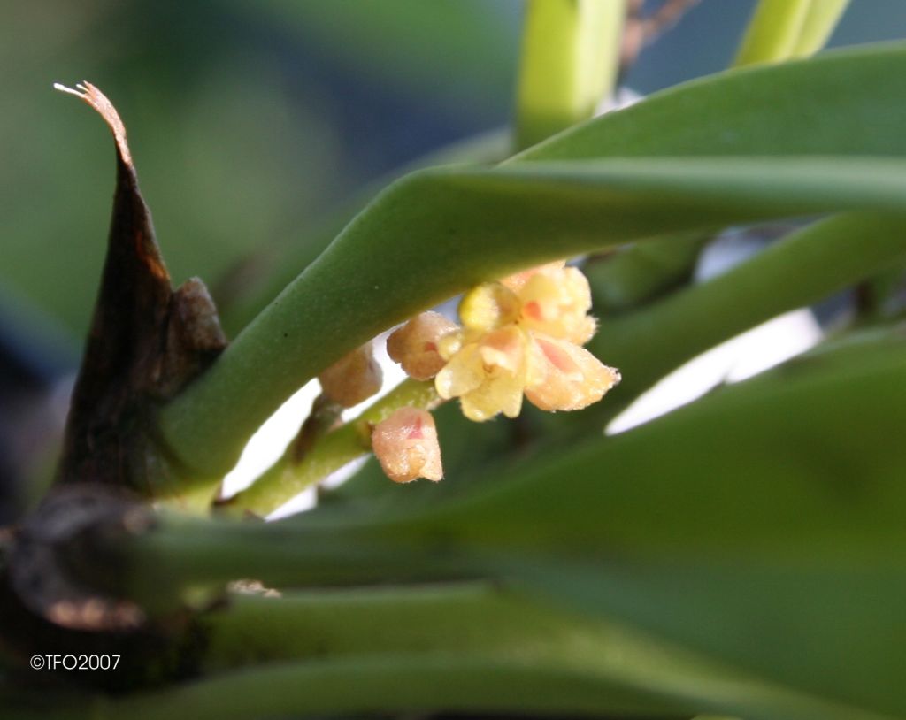 Found in Queensland Australia as a small sized, warm growing epiphyte or lithophyte on trees and rocks in rainforests at elevations of 500 to 1000 meters with crowded, fleshy, green pseudobullbs carrying 2, erect, dark green, thick, linear, gradually narrowing below into the conduplicate base leaves that blooms in the late winter and spring on an arching .8 to 1.6" [2 to 4 cm] long, 3 to 12 flowered inflorescence.
