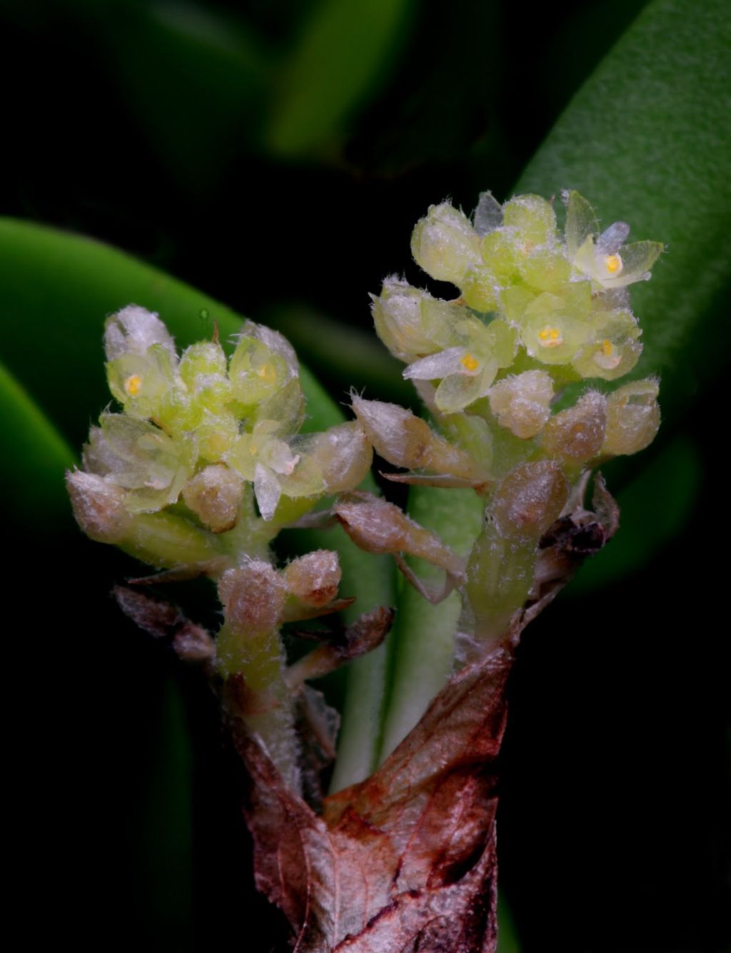Found in Java, Borneo, Lesser Sunda Island, Sulawesi, New Guinea, Solomon Islands, New Caledonia and Christmas Island in rainforests high on trees at elevations of 200 to 300 [1200] meters as a miniature sized, hot to warm growing epiphyte with crowded, fleshy, green pseudobulbs carrying 2, erect, thick, bright green leaves that blooms in the spring on an erect, fleshy, pubescent, .4 to 1" [1 to 2.5 cm] long, 7 to 12 flowered inflorescence and carrying densely crowded flowers