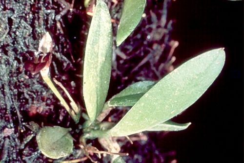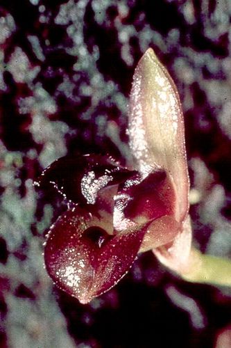 Found in New Guinea on trees in lower montane forests at elevations around 700 to 1000 meters as a mini-miniature sized, warm growing epiphyte with ovoid-conical pseudobulbs carrying a single, apical, erect, oblanceolate-oblong, apiculate leaf that blooms in the winter on a very short, .1 to .18" [2 to 3.5 mm] long, single flowered inflorescence with ovate-acuminate, glabrous, much shorter than the ovary floral bracts.