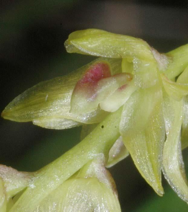 Found in east central Madagascar in humid, evergreen, montane forests at elevations above 900 meters as a small sized, warm to cool growing epiphyte with small globose pseudobulbs carrying a single, apical, large, round, narrow linear, nearly semi-cylindrical, slightly canaliculate above the base leaf that blooms in the late spring and early summer on a red, very thin, to 10" [25cm] long, loosely many flowered inflorescence carrying 3 to 4 very adpressed sheaths with small flowers