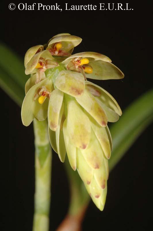 Found in the lichen rich forests of north western Madagascar at elevations around 1500 meters as a small sized, warm growing epiphyte with 1/4 to 1/2" [.8 to 1.2 cm] between each compressed ovoid, yellowish pseudobulb carrying 2 apical, oblong leaves that blooms in the late fall on a 11 to 12" [28 to 30 cm] long, enveloped entirely by 9 to 10 yellowish sheaths each gradually longer than the yellow, narrowing and becoming longer bracts and always twice as long as the flowers, rhachis thin, 4" [10 cm] long, several flowered inflorescence
