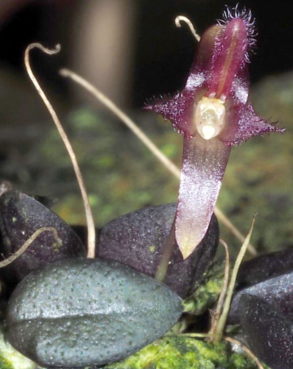 Found in western New Guinea in lower montane forests as a mini-miniature sized, hot growing epiphyte with a nodulous rhizome giving rise to a nearly sessile, ovate, coriaceous leaf that blooms in the spring on an erect, filiform, .48" [1.2 cm] long, provided with a basal cluster of transparent bracts, single flowered inflorescence