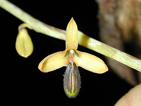 Found in Thailand and Myanmar as a small sized, cool to warm growing epiphyte with a single apical leaf that blooms in the winter and spring on a basal, 8" [20 cm] long, to 15 flowered inflorescence.