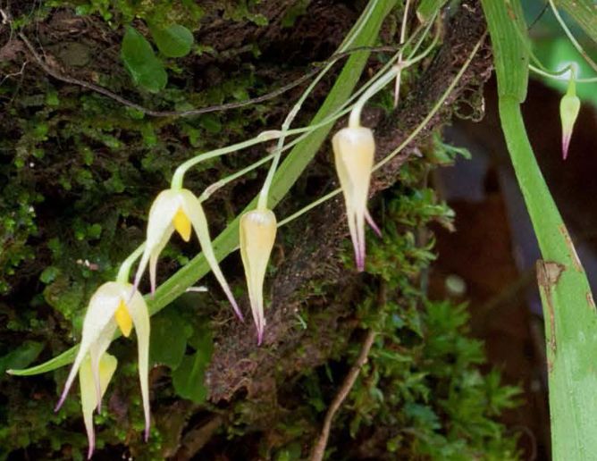 Found in western New Guinea in montane forests on mossy tree trunks at elevations around 1970 meters as a mini-miniature sized, cool growing, clump forming epiphyte with short, creeping and branching rhizom giving rise to close set, cylindrical, slightly gradually widening towards the base, finely longitudinally grooved pseudobulbs and carrying a single, apical, thin coriaceous, narrowly elliptic, apex subacute, minutely mucronate, petiolate base leaf that blooms in the winter on a patent, one or a few from each pseudobulb, 1.8 to 2.4" [4.5 to 6 cm] long, peduncle 1.4 to 2" [3.5 to 5 cm] long, long persistent, provided with 1 or 2, tubular peduncle scales, single flowered inflorescence with an obliquely tubular, apex acuminate floral bract.