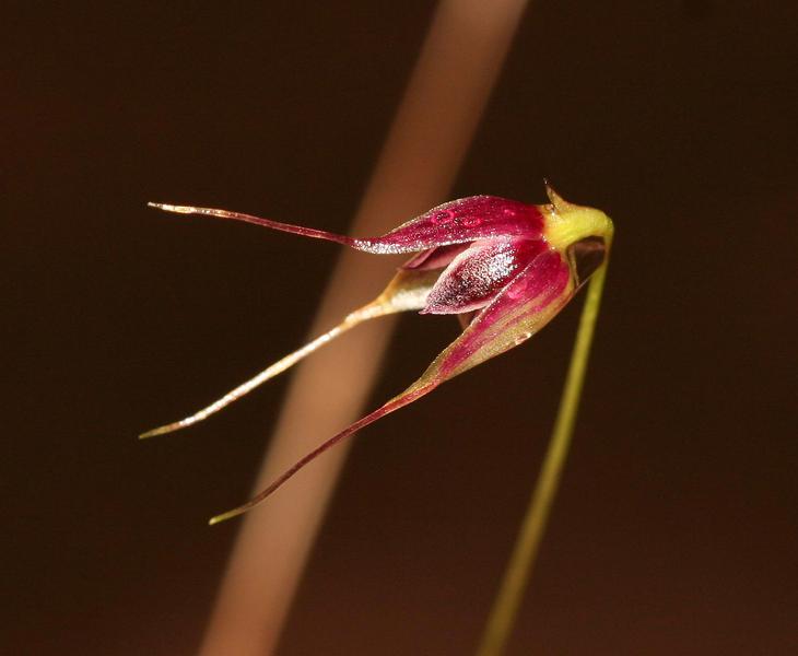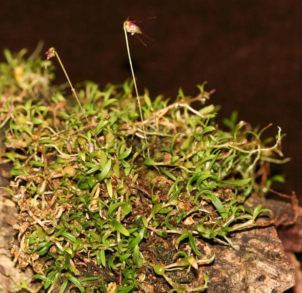 Found in Madagascar in humid evergreen forests on white sand at elevations around 800 to 1400 meters as a mini-miniature sized, warm to cool growing epiphyte with a readily branching rhizome with .4" [1 cm] between each ovoid pseudobulb carrying 2, apical, linear-lanceolate leaves that blooms in the winter and spring on an erect, setiform, 2.4" [6 cm] long, single flowered inflorescence carrying a small flower.
