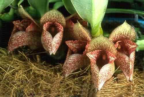 Found in Papua New Guinea as a small sized, warm to cool growing, unifoliate epiphyte at elevations around 820 to 1560 meters with a creeping rhizome with .6" [1.5 cm] between each subglobose,rugose pseuobulbs and carrying a single, apical, erect, oblong-obtuse, subsessile leaf that blooms in the fall, winter and spring on a very short, peduncle.8" [2 cm] long, fasiculate, 2 flowered inflorescence with overlapping, ovate-cucullate, shorter than the ovary floral bracts and carrrying the very fleshy flowers below the leaves up against the pseudobulb.