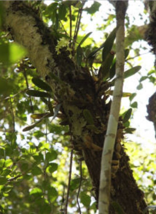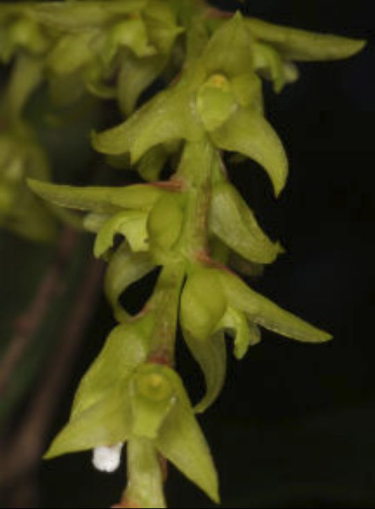 Found in east central Madagascar in humid evergreen forests on a plateau at elevations of 1000 to 1500 meters as a mini-miniature sized, cool growing epiphyte with with .2 to .6" bvetween each, subcylindrical, slightly dilate basally pseudobulbs carrying a single, apcail, erect, ligulate, subacute leaf that blooms in the mid spring and mid summer on a [.2 to .4" [.5 to 1 mm] long, peduncle as long as the pseudobulb, arcuate rachis subloose, to 2" [5 cm] long overall, 2 to 9 flowered inflorescence with oval-apiculate, diaphonous, more than twice as long as the pedicel floral bracts.