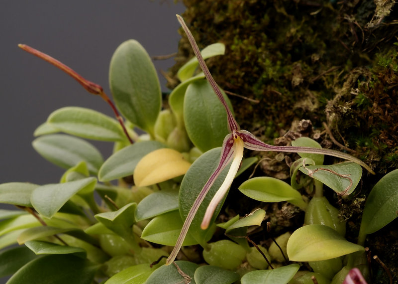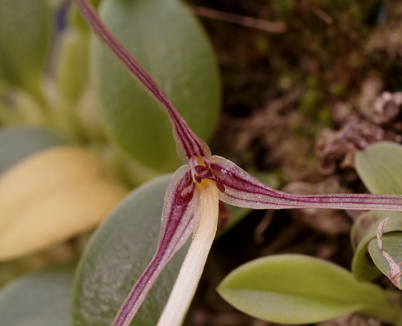 Found in New Guinea at elevations around 2400 to 3100 meters as a mini-miniature sized, cold growing epiphyte with a short, creeping rhizome giving rose to ovoid, not angular, smooth or shallowly longitudinal grooved, pseudobulbs carrying a single, apical, erect, subcoriaceous, glabrous, lanceolate-ligulate, subacute, narrowing below intothe subpetiolate base leaf that blooms in the spring, summer and fall on a basal, erect to suberect, filiform, single flowered, .6 to .8" [1.5 to 2 cm] long inflorescence with elliptic, apiculate, clasping, much shorter than the pedicellate ovary floral braccts and carrying an erect to suberect flower.