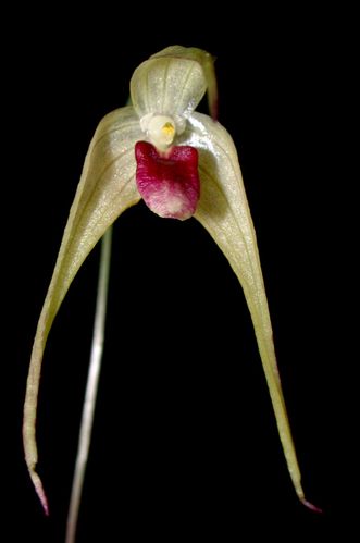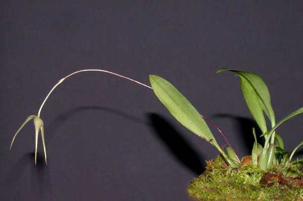 Found in Papua New Guinea in primary forests at elevations around 1800 to 2000 meters as a mini-miniature sized, cool growing epiphyte with a creeping rhizome giving rise to ovoid pseudobulbs carrying a single, apical, elliptic, acute to acuminate, narrowing below into the petiolate base leaf that blooms in the fall and winter on a basal, 5.6" to 10.4" [14 to 26 cm] long, single flowered inflorescence with tubular, much shorter than the ovary floral bracts.