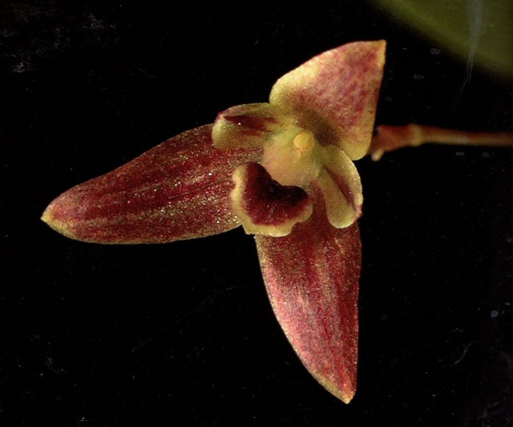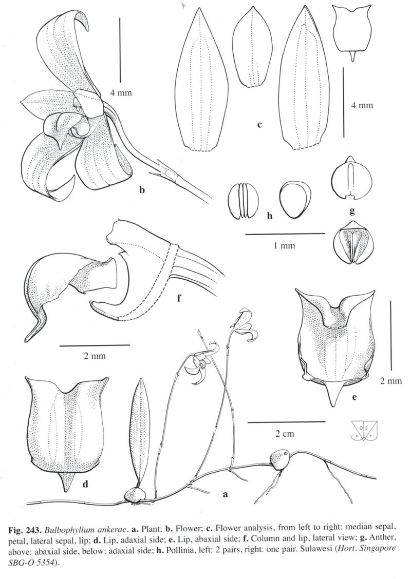 Found in Sulawesi in primary forests at elevations of 1100 to 1400 meters as a mini-miniature sized, cool growing epiphyte with a long creeping, straggling rhizome with soon evanesc ent sheaths and with .2 to 2.6" [.5 to 6.5 cm] between each, somewhat erect, ovoid to globose, angular pseudobulb carrying a single, apical, erect, elliptic to ovate,acute to minutely cuspidate, petiolate bsae leaf that blooms on an erect,peduncle 1.32 to 2" [3.3 to 5 cm] long, provided with 2 bracts, rachis .28 to .4" [.7 to 1 cm] long, single flowered inflorescence with acute, much shorter than the ovary floral bracts.