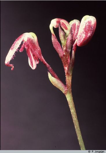 Schlechter states that the flowers are red, the petals ate white at the base, the lip dark red with little white ears and a white margin, and the column is white with a red foot.