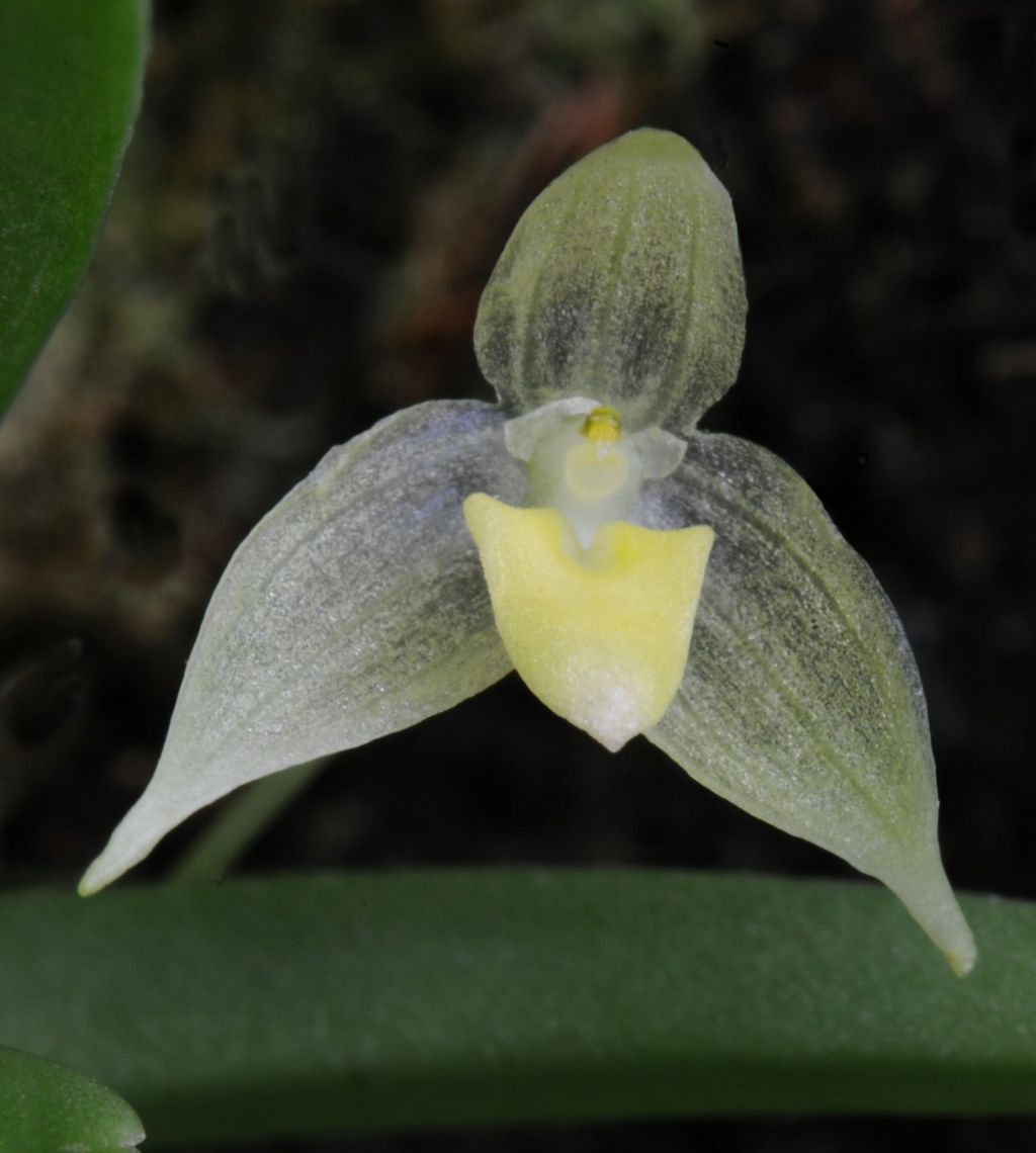 Found in New Guinea, New Caledonia and Fiji in dense rain forests at elevations around 200 to 1200 meters as a small sized, hot to warm growing epiphyte with close set, pear-shaped, hardly flattened pseudobulbs carrying a single, apical, elliptic to obovate, acute leaf that blooms in the late spring through winter on an erect, Peduncle 1.2 to 2.6" [3 to 6.5 cm] long, 1.8 to 3" [4.5 to 7.5 cm] long overall, single flowered inflorescence with tubular, shorter than the ovary floral bracts