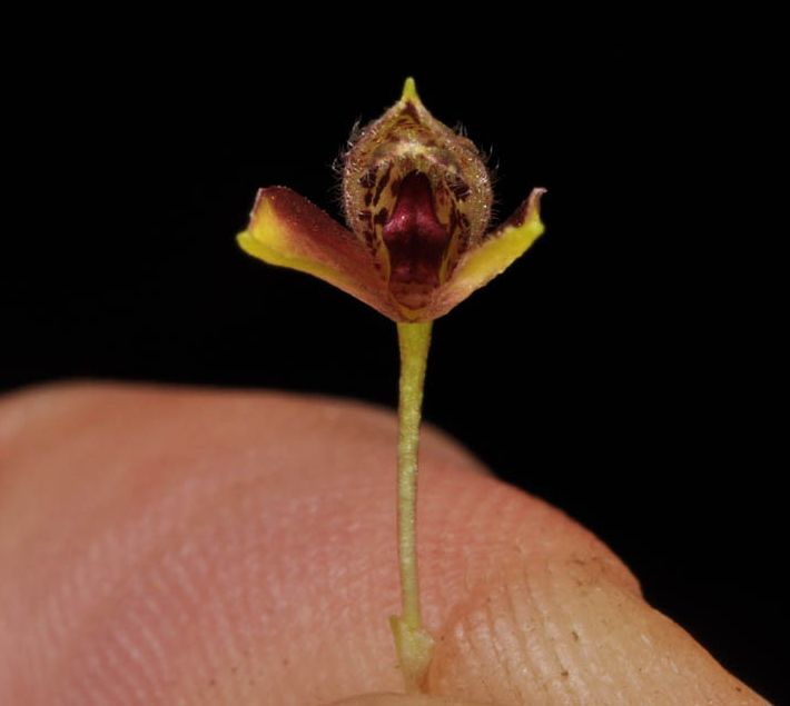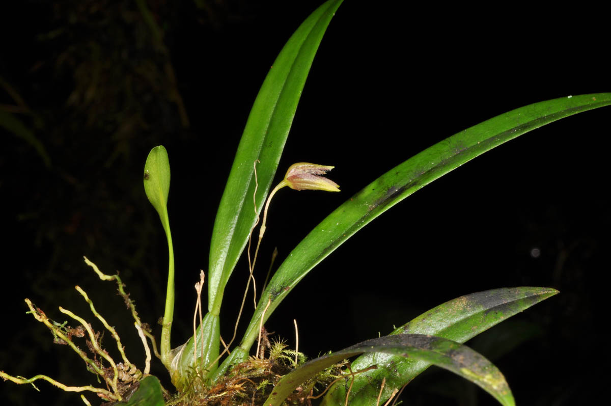 Found in the Philippines on mossy trees at elevations around 2000 meters as a mini-miniature sized, cool to cold growing epiphyte with clustered, narrowly pear-shaped pseudobulbs carrying a single, apcial, erect, strap-shaped, lanceolate,acute, narrowing at both ends leaf that blooms in the spring on numerous, erect, basal or from the rhizome, slender, 1.2" [3 cm] long, single flowered inflorescence.