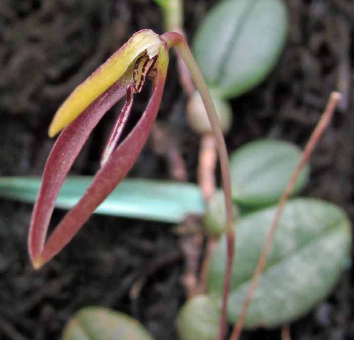 Found in New Guinea on trees in lowland forests without elevational data as a mini-miniature sized, hot growing epiphyte with a short rhizome giving rise to appressed, oblong pseudobulbs carrying a single, apical, elliptic to obovate, obtuse leaf that blooms in the fall on an erect, filiform, few bracted, to 1.2 to 1.8" [3 to 4.5 cm] long, single flowered inflorescence with small floral bracts.