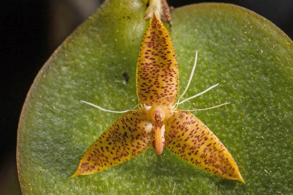 Found in the Philippines on Mindanao Island on mossy trees as a miniature sized, cool growing epiphyte with cylindrical, terete, pendulous, branching rhizome enveloped completely by dried cataphyls with .2 to 1” [.5 to 2.5 cm] between each, four angled, slightly flattened, curved pseudobulbs carrying a single, apical, broadly ovate, leathery, apex acute, margins revolute leaf that blooms in the later spring on a basal, peduncle short, successively 1, few flowered inflorescence.