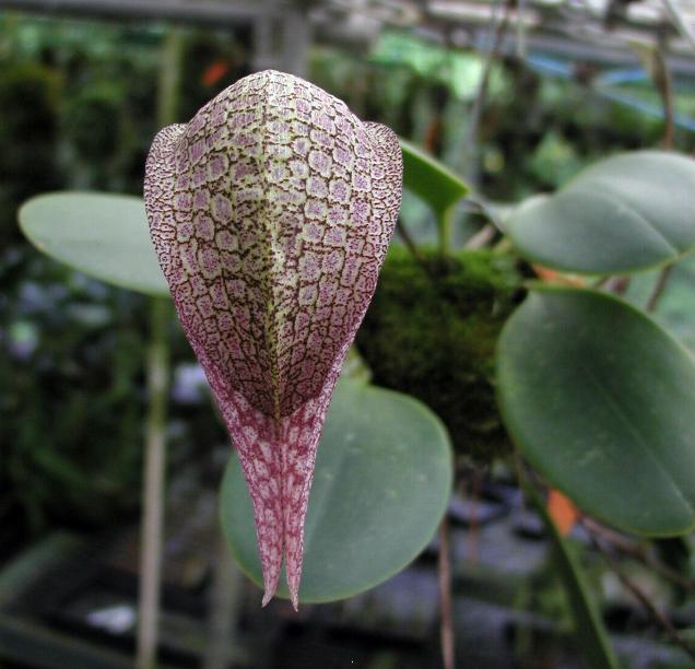 Found in the Arfak Mountains of Papua New Guinea as a small sized, unifoliate, hot growing epiphyte at elevations of 50 to 400 meters in rainforests, farmland margins and river valleys on tree branches with an ascending growth habit and pseudobulbs that are 1" [2.5 cm] apart on the rhizome and blooms in the late winter and spring as well as late summer and fall on a to 5 1/2" [to 14 cm] long, stout inflorescence with triangular bracts and carrying a solitary flower held well above the leaves.