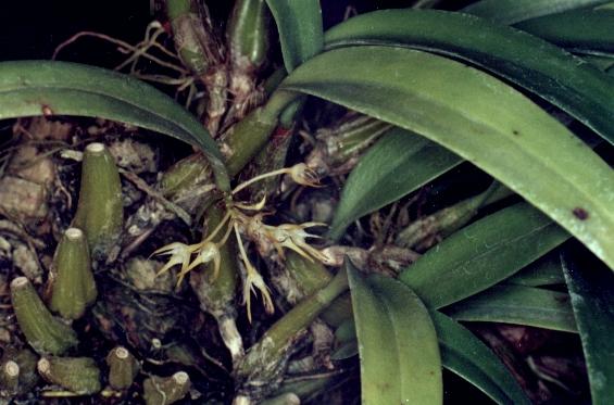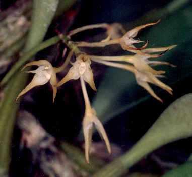 Found in the Philippines as a small sized, unifoliate, hot growing orchid with ovoid, slightly compressed, lightly grooved pseudobulbs carrying a single, apical, leathery, oblong-obtuse leaf that blooms in the fall on a 2" [5 cm] long infloresence with 2 oblong, obtuse bracts and lanceolate, acuminate floral bracts all carrying 8 to 10 crowded, subumbellate flowers