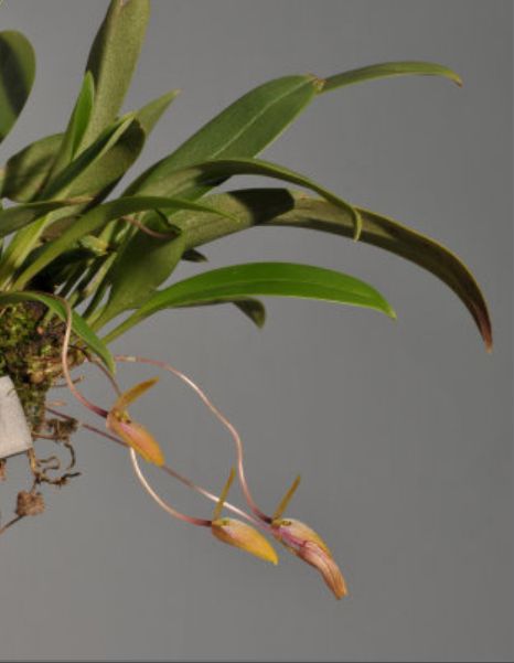 Found only in New Guinea on mossy trees in montane forests near rivers at elevations around 350 to 450 meters as a miniature sized, hot growing epiphyte with close set, alternate, narrowly cylindrical pseudobulbs carrying a single, apical, erect, coriaceous, narrowly ligulate, minutely apiculate, narrowing below into the petiolate base leaf that blooms in the spring on a basal, short to .44" [1.1 cm] long, drooping, single flowered inflorescence with tubular tubular, keeled, acuminate floral bracts.