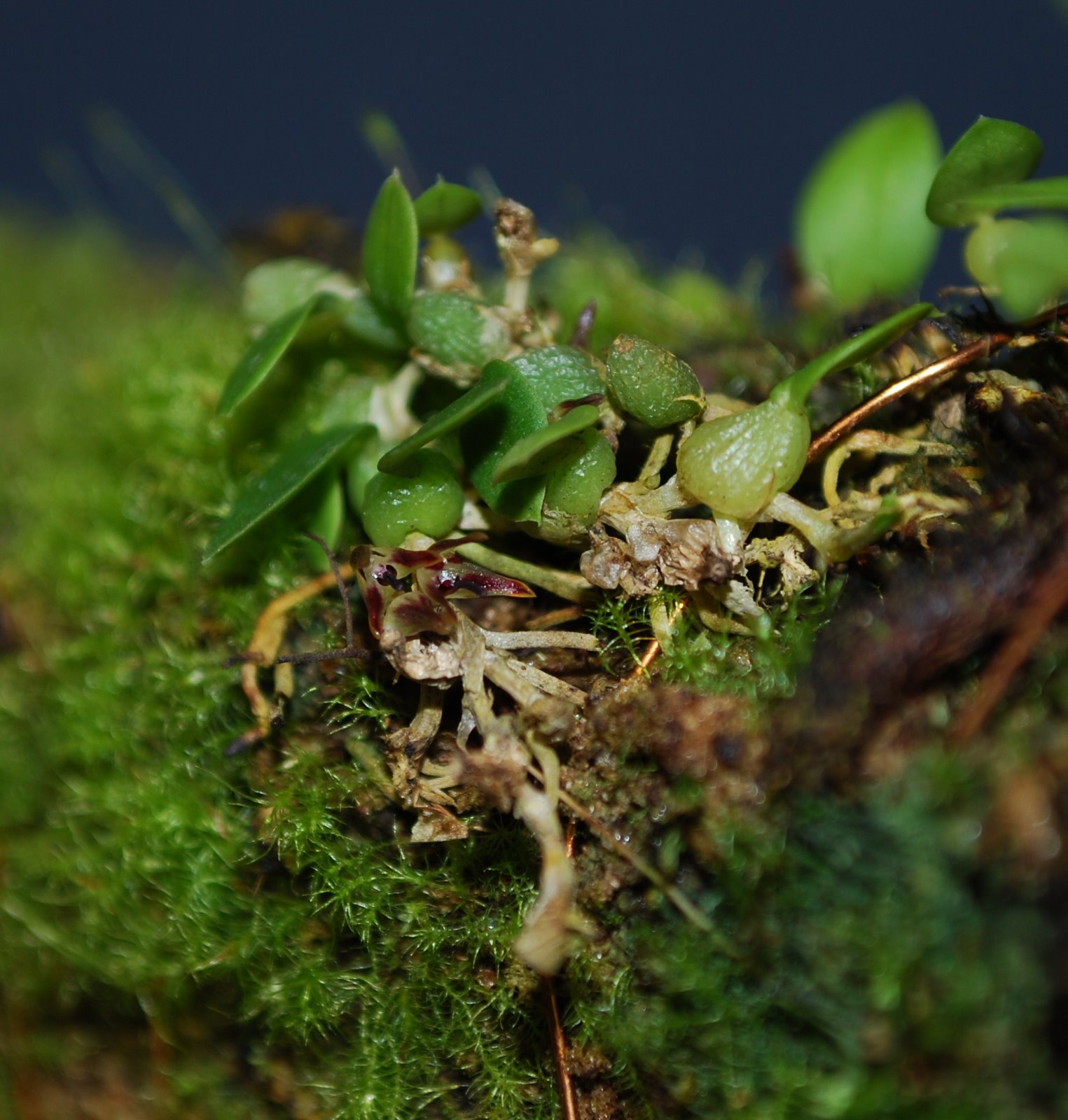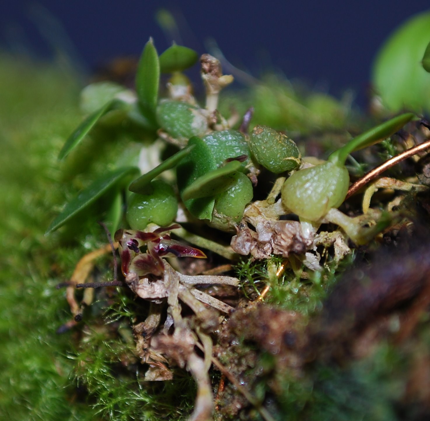 Found in Sulawesi on isolated trees in windswept plains at elevations around 1700 meters as a mini-miniature sized, cool growing epiphyte with well spaced, ovoid pseudobulbs carrying a single apical, erect, ovate, acute, gradually narrows into the shortly petiolate base leaf that blooms on a basal, patent, 1/4 to .4" [.8 to 1 cm] long, single flowered inflorescence with a tubular, acute floral bract.