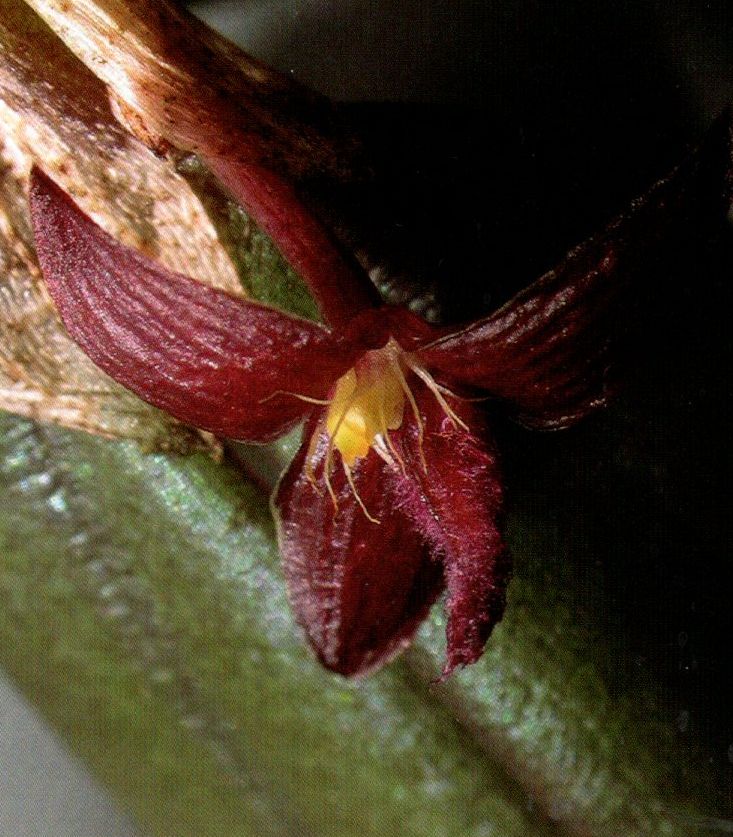 Found in Sulawesi in montane riverine forest at elevations around 1000 meters as a mini-miniature sized, warm to cool growing epiphyte with a patent to hanging rhizome with persistent bracts with .28 to .64" [.7 to 1.6 cm] between each ellipsoid to obovoid pseudobulbs carrying a single, apical, erect, s dark green, suffused with purplish red, elliptic round to obtuse, narrowing below into the petiolate base leaf that blooms in the late fall and again in the spring on a porrect, peduncle ca .16" [.4 cm] long, provided with 3 bracts, raceme .52" [1.3 cm] long overall, single flowered inflorescence with a tubular acute, shorter than the ovary floral bract and carrying wide opening flowers with the sepals and lip purplish red, the petals white with the tips of the filaments yellow and a pale greenish column.