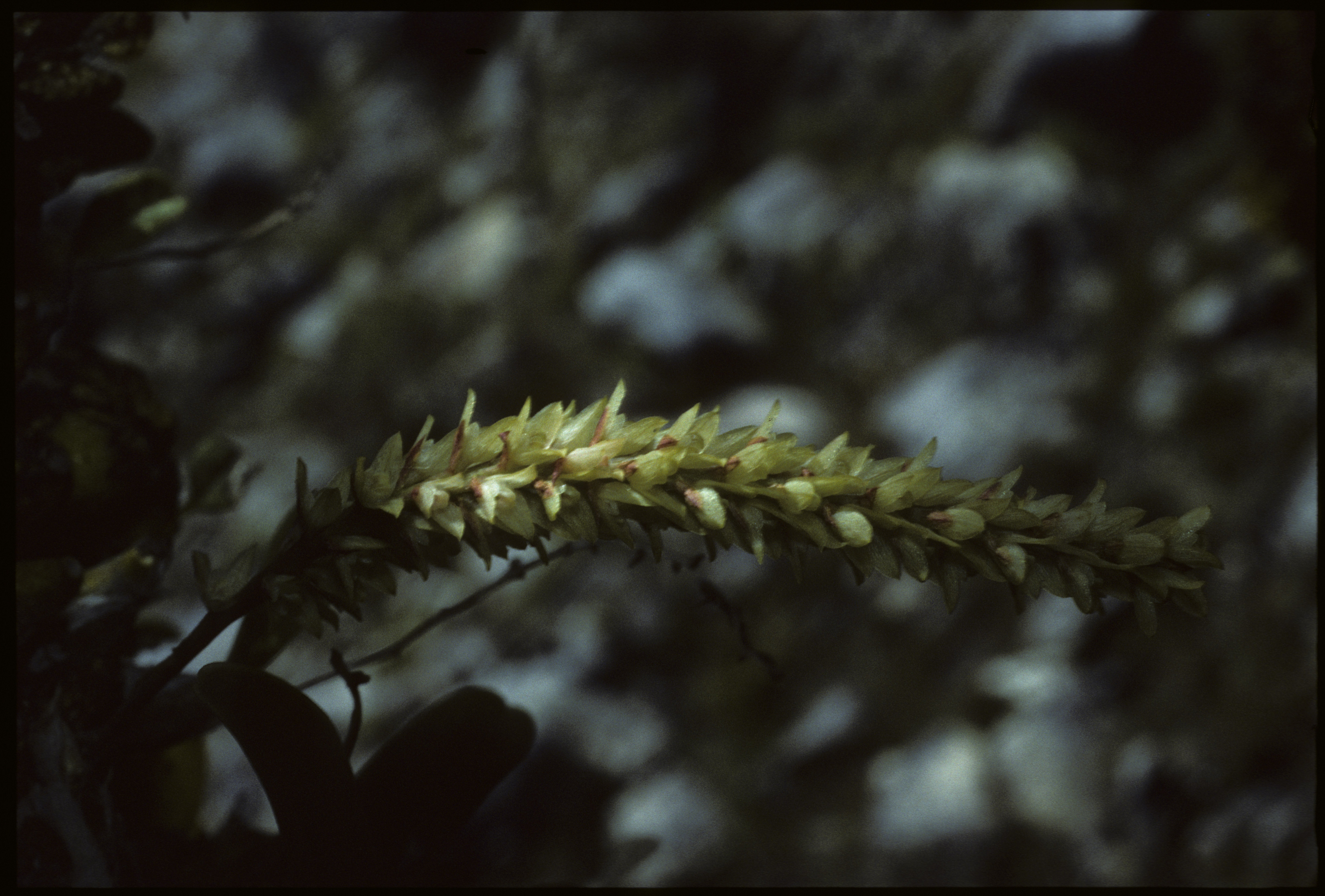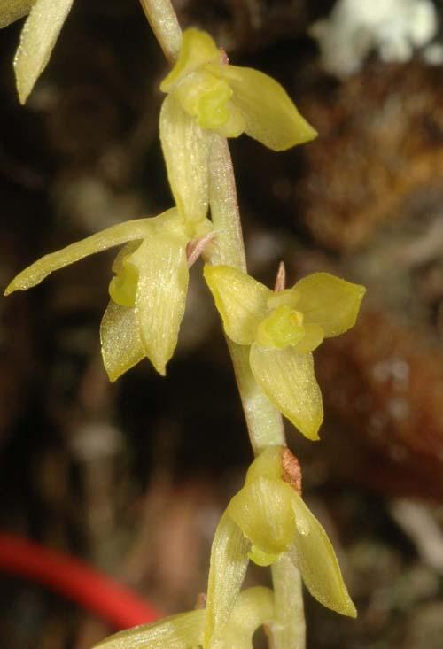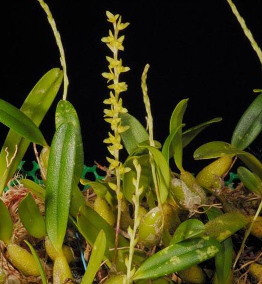 Found in east central Madagascar in humid, lichen rich, evergreen forests at elevations of 720 to 2200 meters as a miniature sized, warm to cold growing epiphyte or occasional lithopythe with close-set, oblong to ovoid-conical pseudobulbs carrying a single, apical, narrowly retracted-petiolate basally leaf that blooms in the spring through summer on a basal, 3 1/4" to 4 3/4" [8 to 12 cm] long, racemose inflorescence with many closely spaced flowers