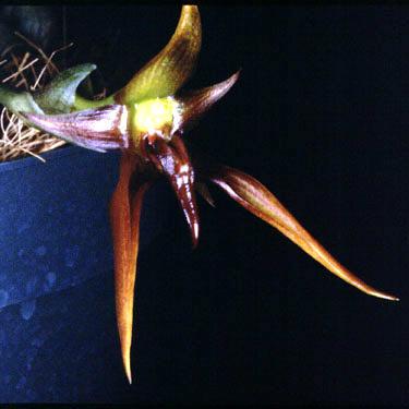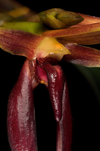 Found in the Philippines as a hot growing, miniature to small sized, epiphytic orchid with obliquely ovoid pseudobulbs carrying a single, apical, erect, fleshy, leathery, lanceolate, obtuse, gradually narrowing below into the channeled petiolate base leaf that blooms on a basal, erect, 3.4" [8.5 cm] long, few flowered, purple, shiny inflorescence with erect, tubular, adpressed bracts and carrying successively opening, shiny, fragrant flowers