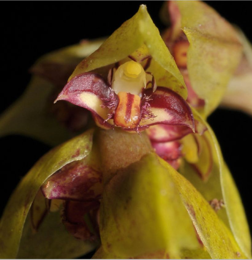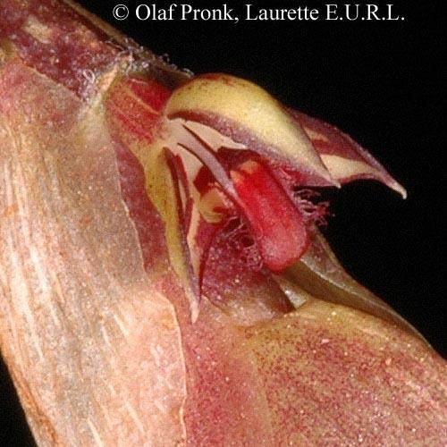 Found in Madagascar in humid, lowland, evergreen forests at elevations around 300 to 1000 meters as a miniature sized, hot to warm growing epiphyte with a thin rhizome and 3/4" to 1.2" [2 to 3 cm] between each small, tetragonal, yellowish pseudobulb carrying 2 apical, oblong, thick leaves that blooms in the summer and fall on a 6" [15 cm] long, several flowered inflorescence with an apical grouping of red, imbricating, oval-acute bracts arranged in three rows and completely covering the small flowers