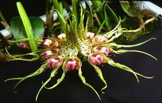 Found in Java and Borneo in moss forests at elevations around 1000 to 1400 meters on rotting logs and in areas rich in humus as a small sized, cool growing epiphyte with large laterally compressed, cylindric pseudobulbs carrying a single, apical, oblong, bluntly tapered, petiolate, large leaf that blooms in the spring on a 6 to 8" [15 to 20 cm] long, several [8 to 12] flowered inflorescence that holds the fetid smelling flowers beneath the leaf.