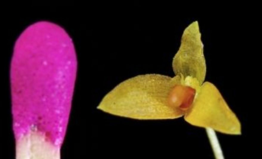 Found in Thailand, penninsular Malaysia and Borneo in ridge forests and in lowland and podzolic forests at elevations around 300 to 1900 meters as a mini-miniature sized, hot to cool growing epiphyte with oblique to the rhizome, alternately curved to one side and the other so they appear in two rows pseudobulbs and carrying a single, erect to oblique, acute, oblanceolate leaf that blooms on a basal, peduncle .28 to .68" [.7 to 1.7 cm] long, provided with 2 scales, to .6" [1.5 cm] long overall, single flowered inflorescence with shorter than the ovary floral bracts.