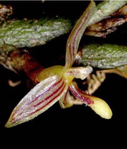 Found in Papua New Guinea on tree trunks at elevations around 25 meters as mini-miniature sized, hot growing epiphyte with an erect to patent rhizome with .16 to .24" [.4 to .6 cm] between each ovoid pseudobulb carrying a single, apical, erect, elliptic, apiculate, petiolate base leaf that blooms on a porrect, .4" [1 cm] long, 1 bracted, single flowered inflorescence with tubular, apiculate floral bracts.