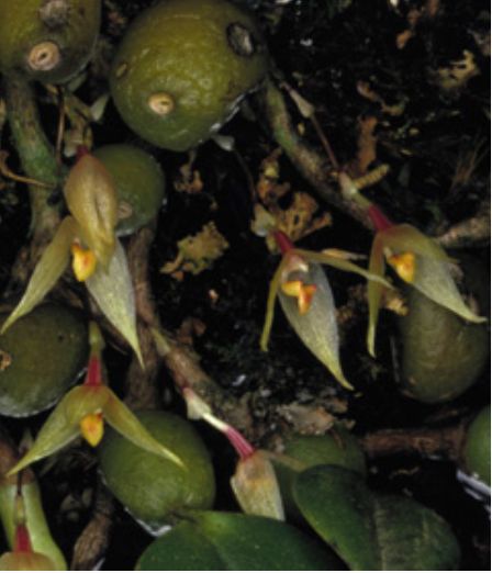 Found in eastern New Guinea in shady forests at elevations around 2200 to 3000 meters as a mini-miniature sized, cold growing epiphyte with a creeping rhizome with .6 to 1.2" {1.5 to 3 cm] between each ovoid to ellipsoid to globose, not to hardly flattened pseudobulb carrying a single, apical, elliptic, acute apically, shortly petiolate base leaf that blooms in the the fall and spring on a single, peduncle .2 to 1.2" [.5 to 3 cm] long, with 4 bracts, 1.2 to 1.6" [3 to 4 cm] long overall, rachis single flowered inflorescence with tubular, obtuse to acute apically floral bracts and carrying moderately opening flowers with pale yellow to white sepals the petals sometimes with a purple apex, and margin, and the lip is bright yellow sometimes with purple along the margins.
