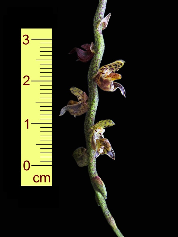 Found in Bahia state of Brazil in the Atlantic rainforest at elevations above 700 meters as a mini-miniature sized, warm growing, repent epiphyte with a long rhizome giving rise to red, rugose, tetragonal pseudobulbs carrying a single, apical, erect, subcoriaceous, green yellow leaves that blooms in the late spring on an erect, peduncle flexuous, 12" [30 cm] long, enveloped by persistent, membraneous, amplexicaul bracts, rachis geniculate, 3.2 to 4" [8 to 10 cm] long, alternate, successively 4 to 5 at anthesis, 7 to 15 flowered inflorescence with membraneous, persistent, triangular floral bracts carrying non-resupinate but positioned like this because of the curvature of the inflorescence.